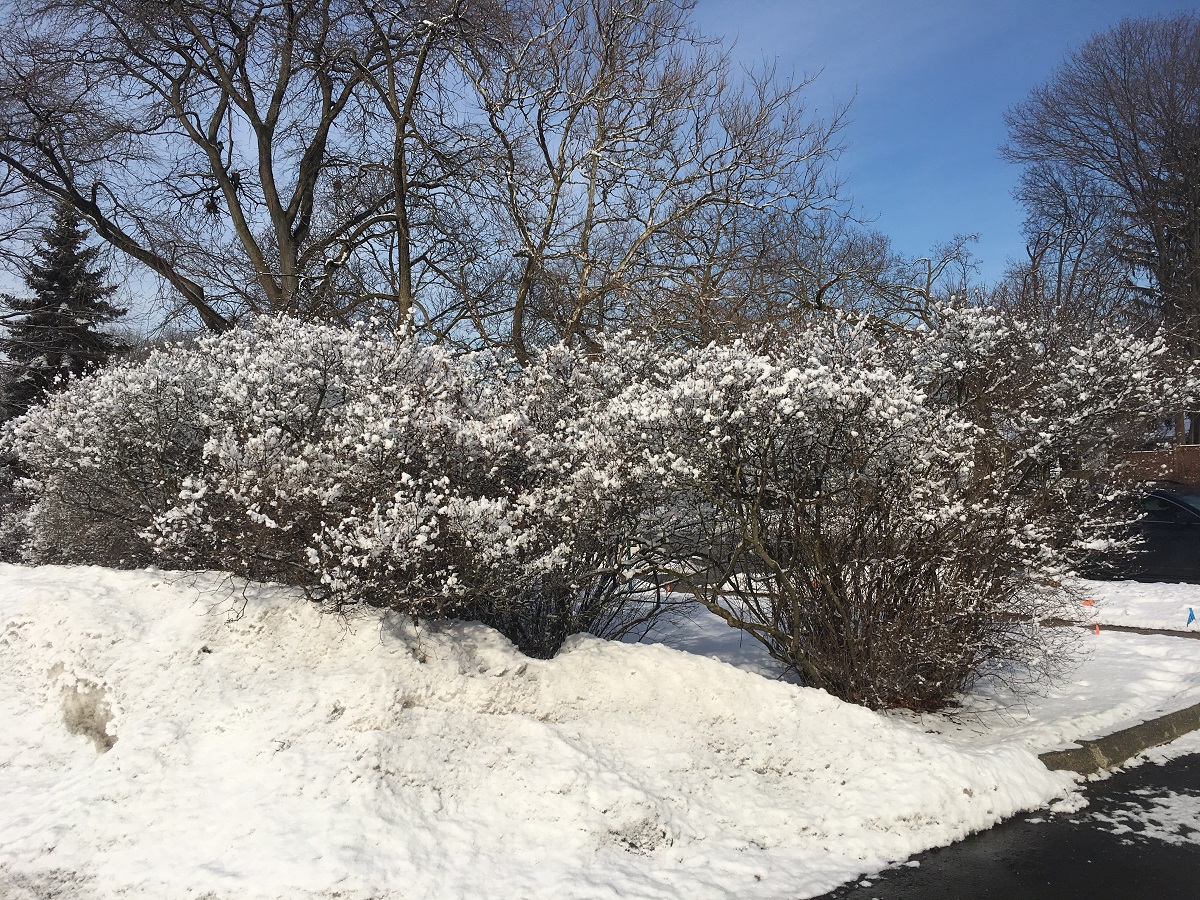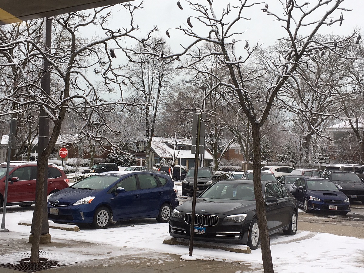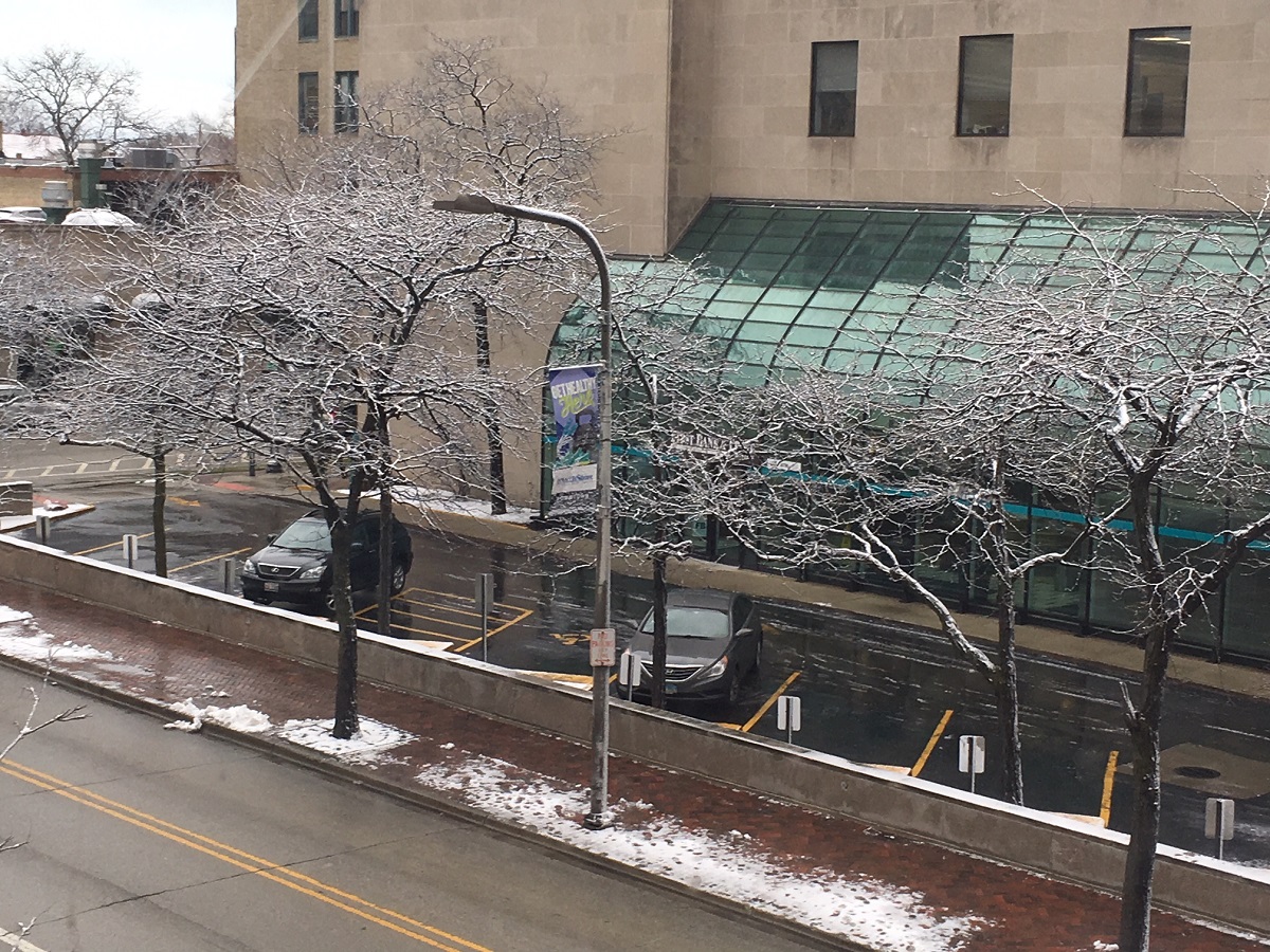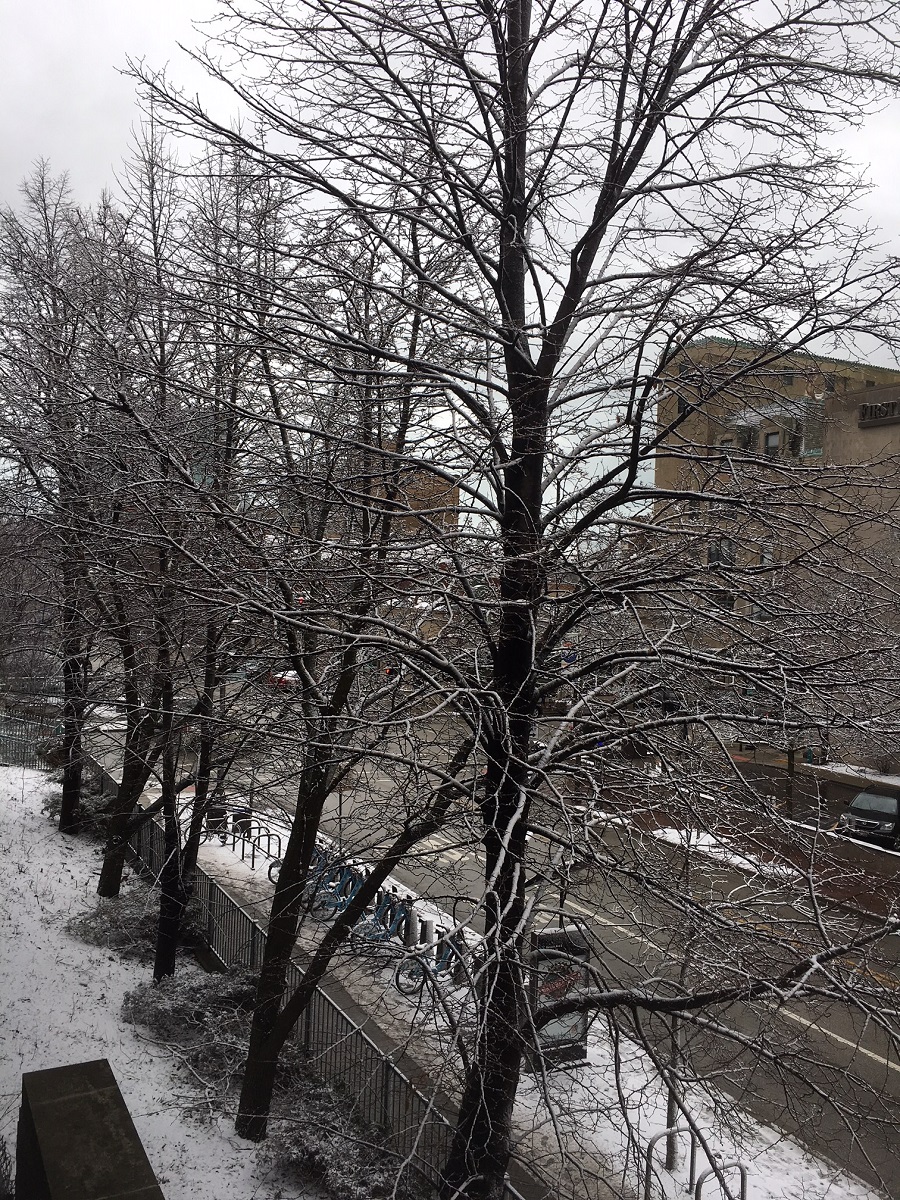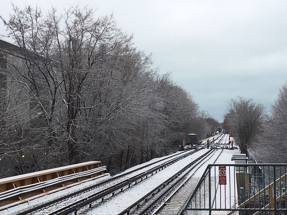 Snow trimming branches from Davis Street "L" -- January 23, 2018