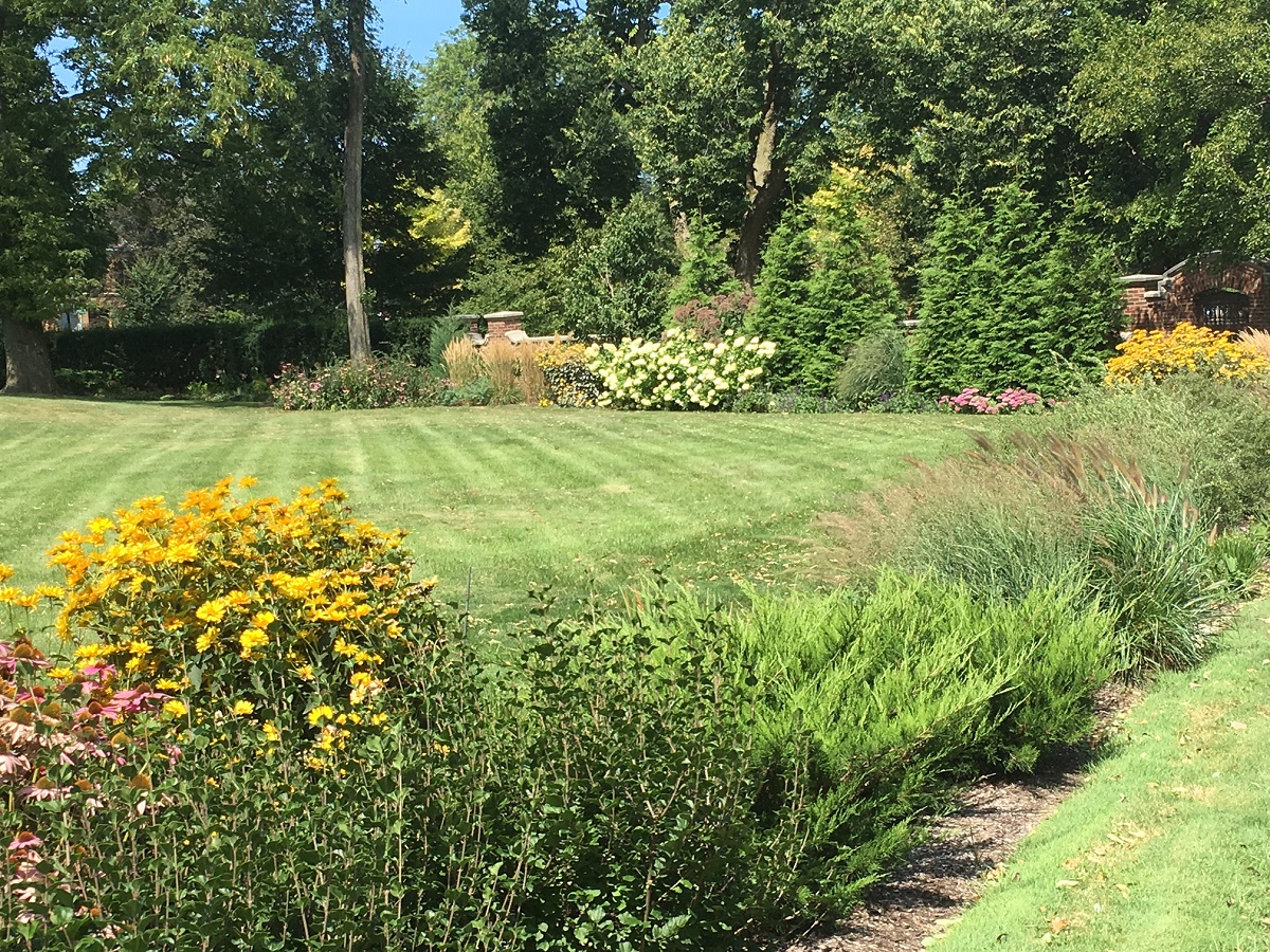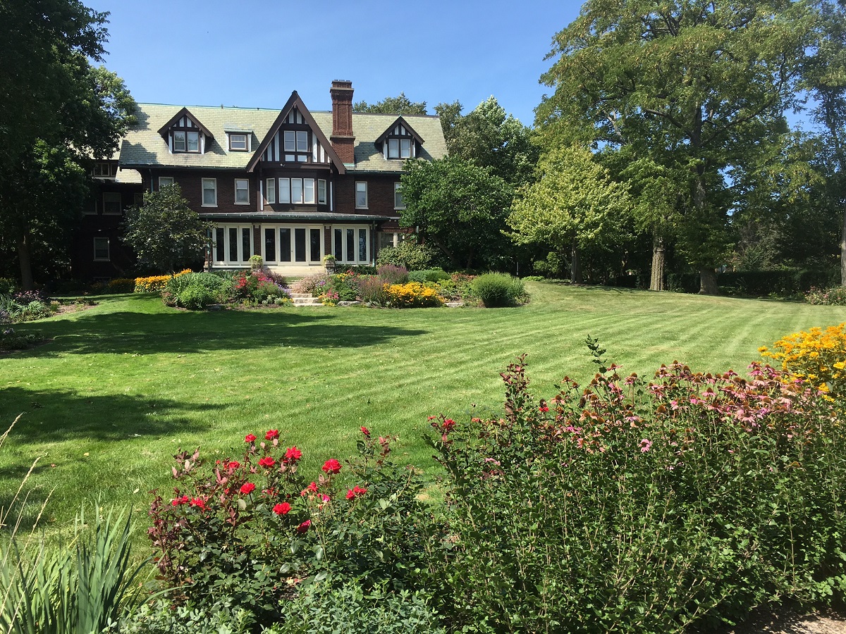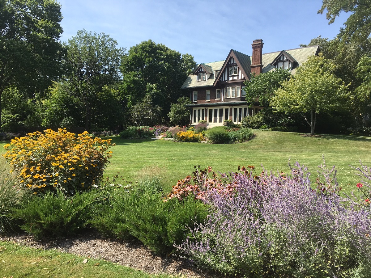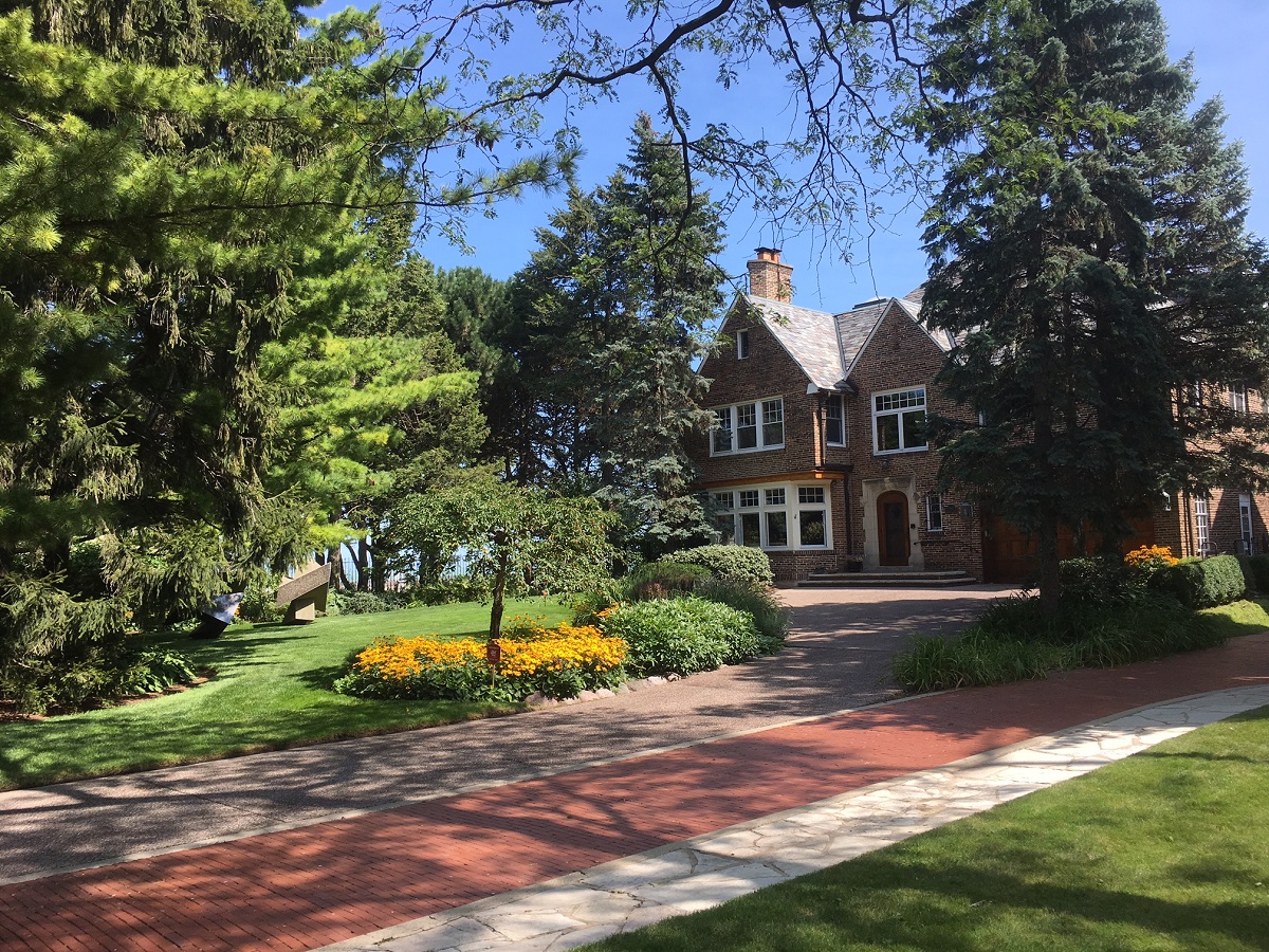 More flowers and art in the front yard of the largest mansion at the northeast corner of Edgemere Court