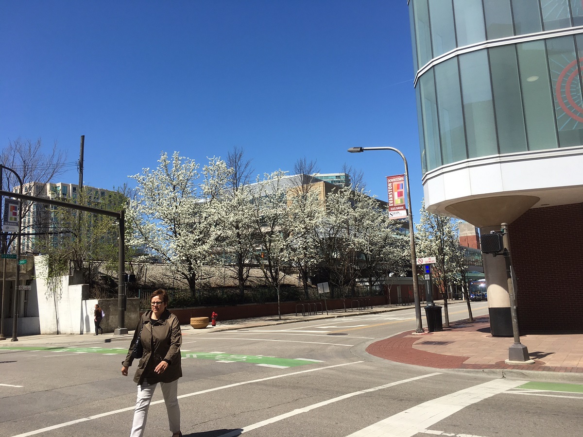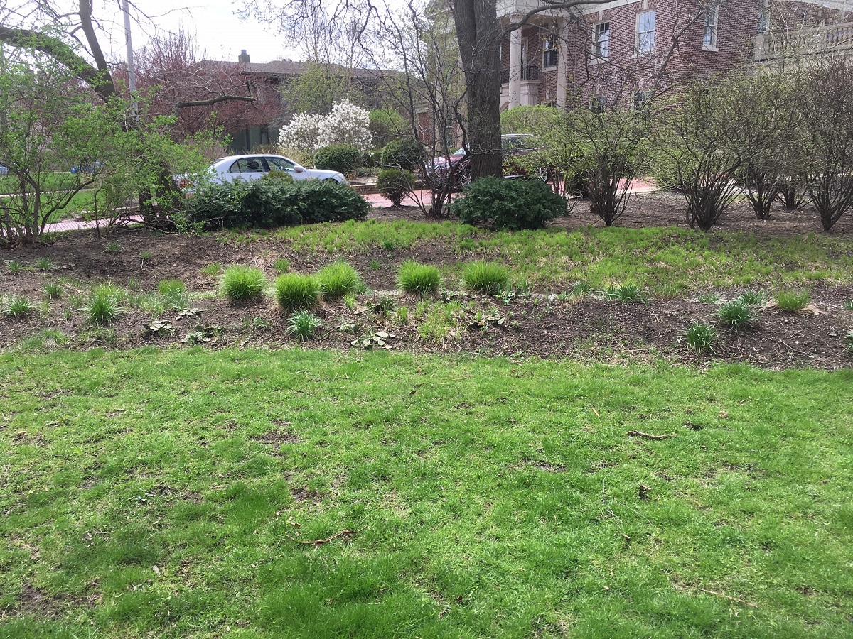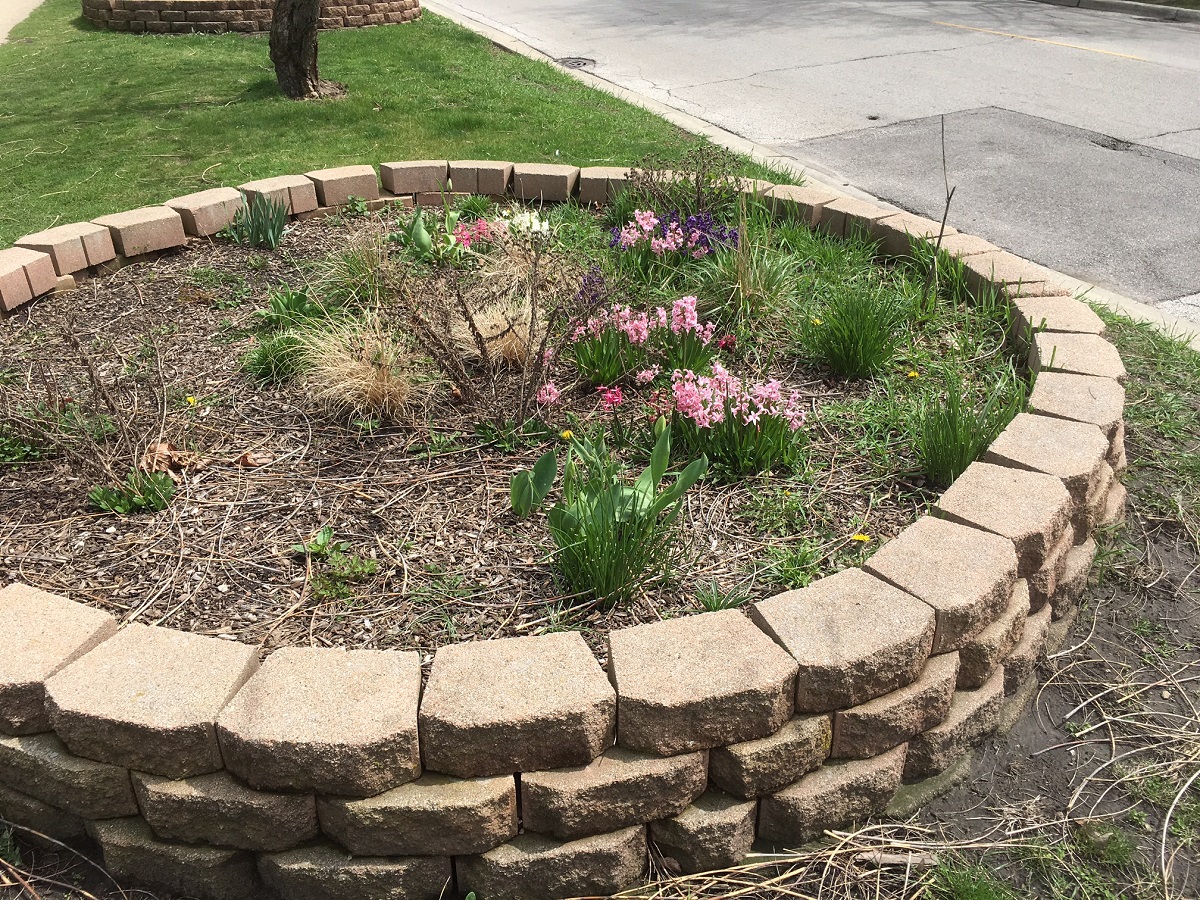 White crabapples and Marjorie's rain garden south of Unitarian Church on Easter -- 4/16/2017