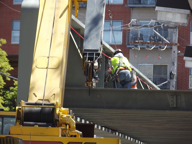 Dempster viaduct from northeast showing crane lifting another angular brace -- 4/27/12