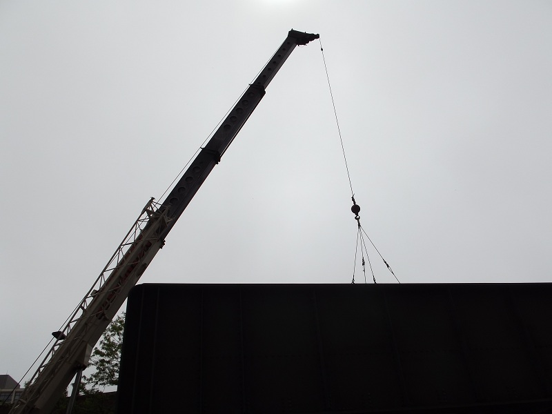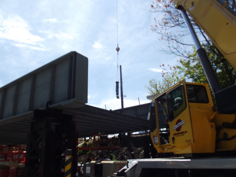 Grove viaduct -- crane lifting stack of wide steel plates into place -- 5/4/12
