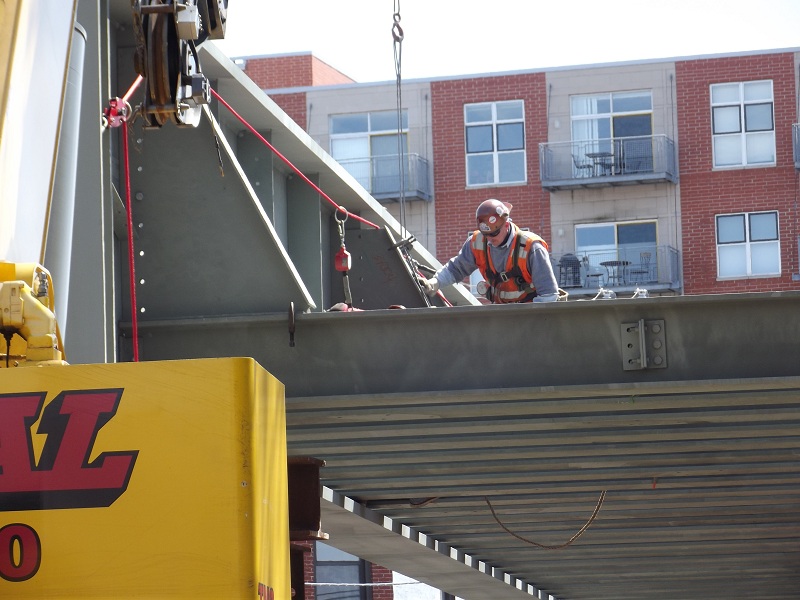 Grove viaduct showing X braces and workers bolting together many short sections between cross beams -- 4/27/12