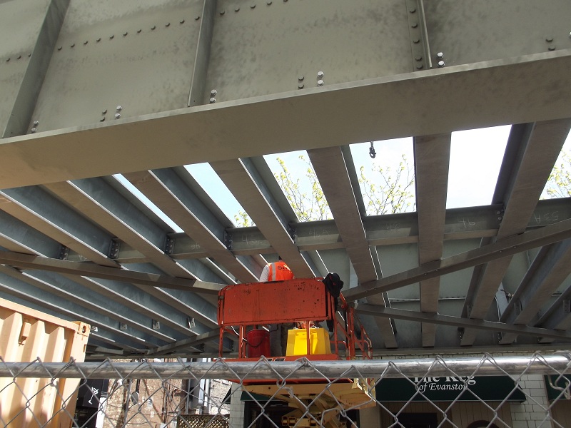 Dempster viaduct showing most cross beams in place and workers bolting angular brace to east side -- 4/27/12
