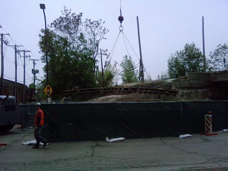 Grove viaduct showin crane lifting stack of bending flat steel plates from ground to viaduct -- 5/4/12