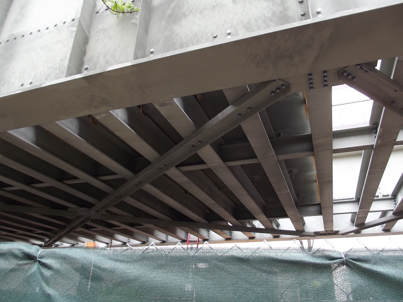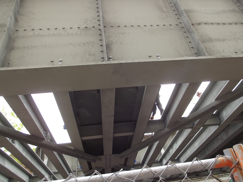 Grove viaduct showing one set of wide steel plates being bolted into place above cross beams -- 5/4/12