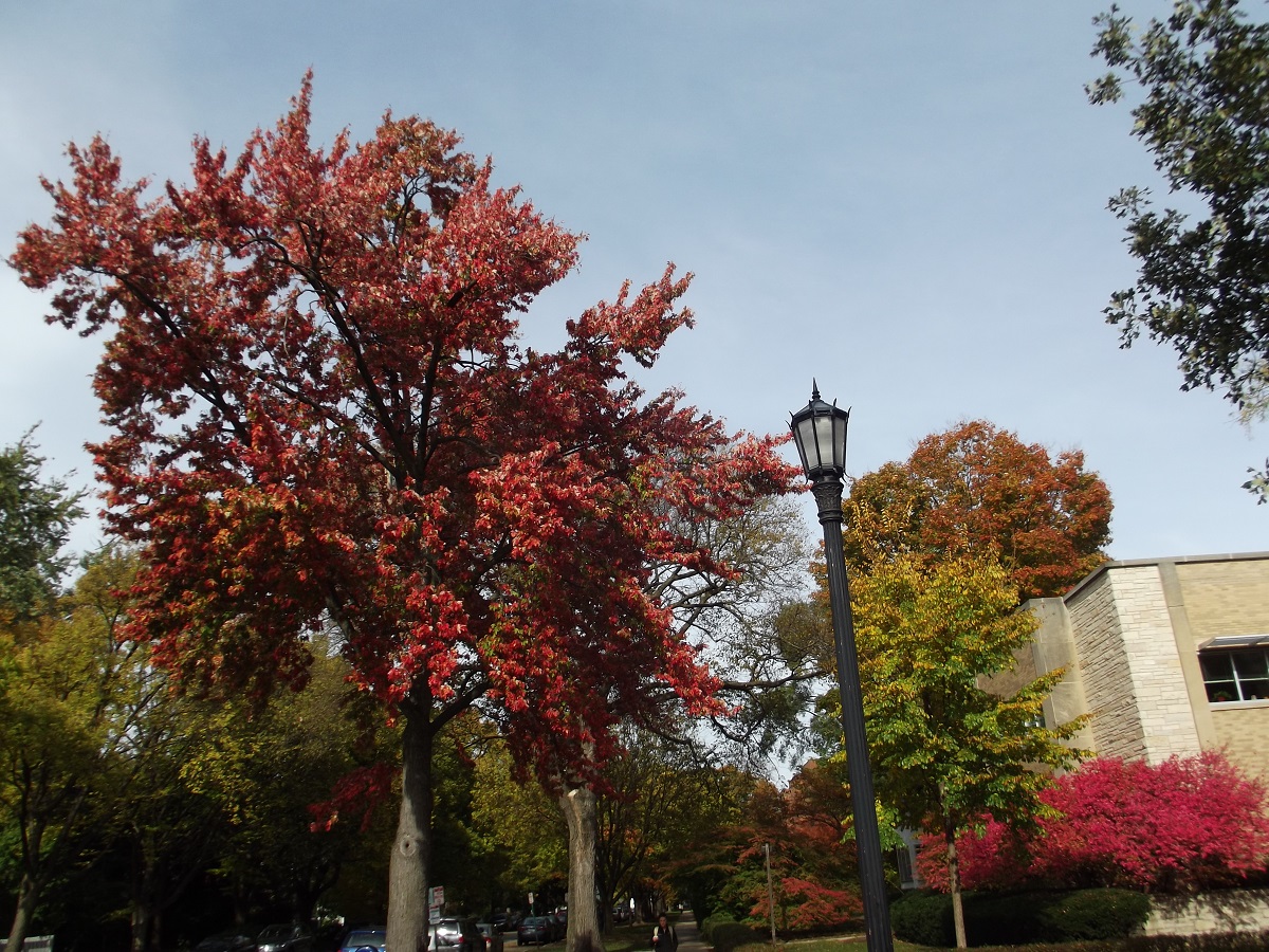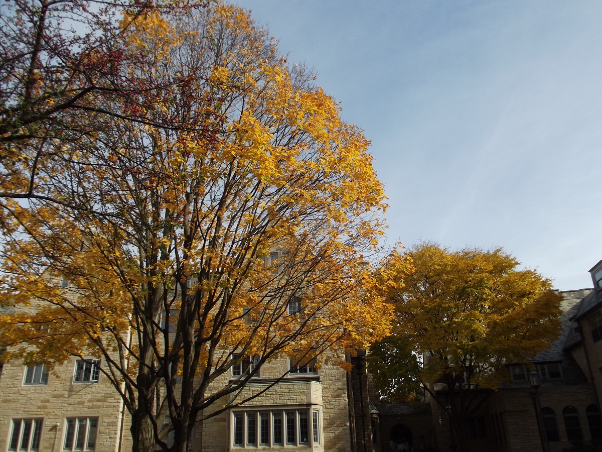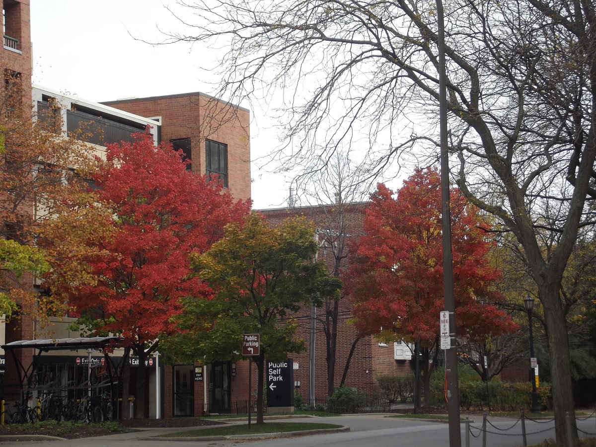 Two yellow maple trees among Northwestern greeks between Emmerson and University Place
