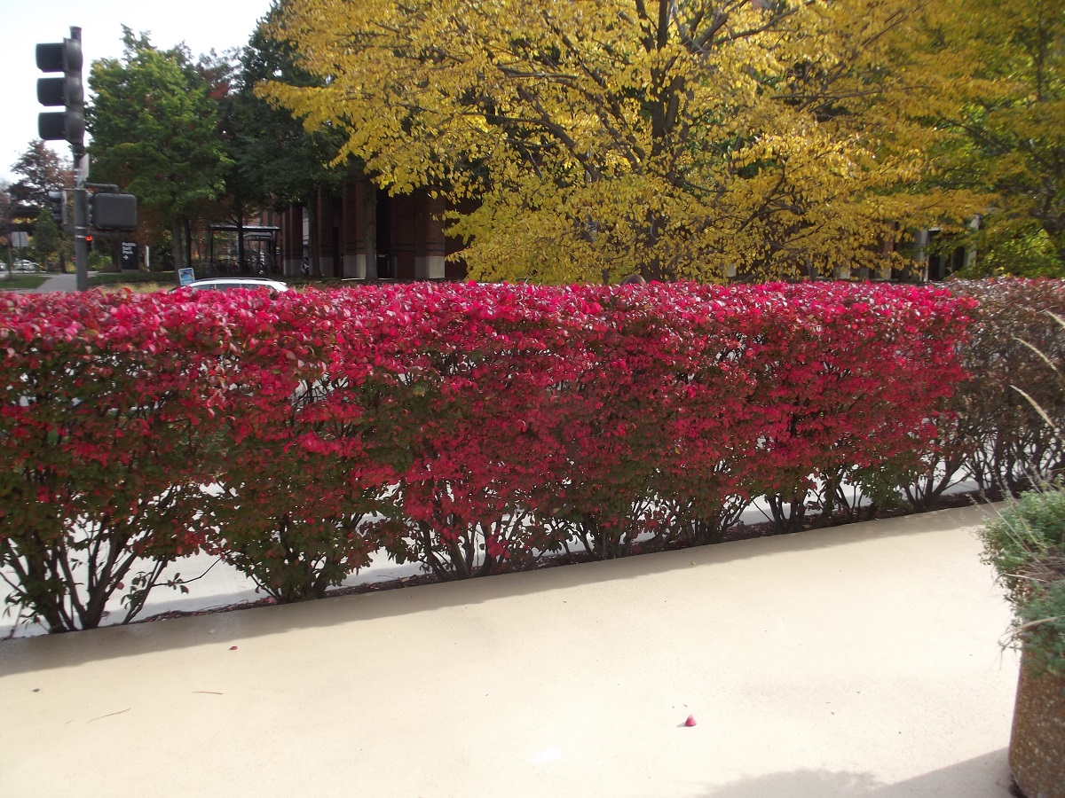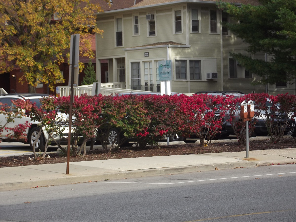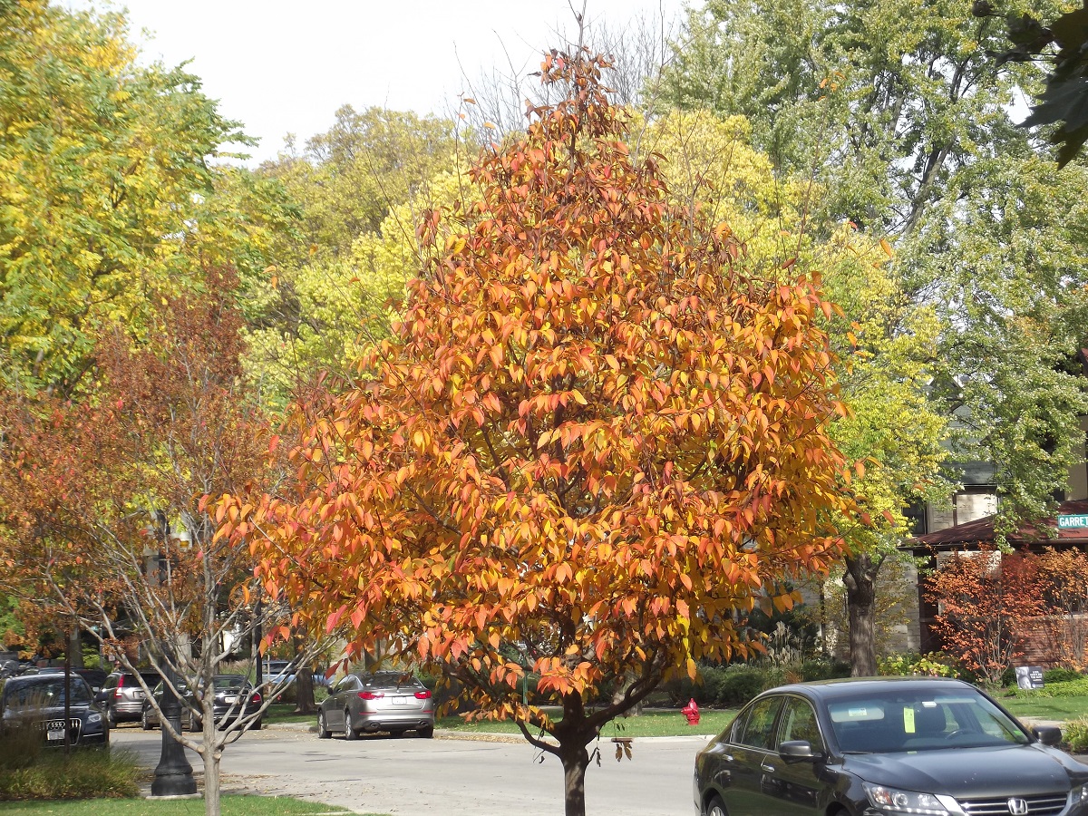 Two yellow maple trees among Northwestern greeks between Emmerson and University Place