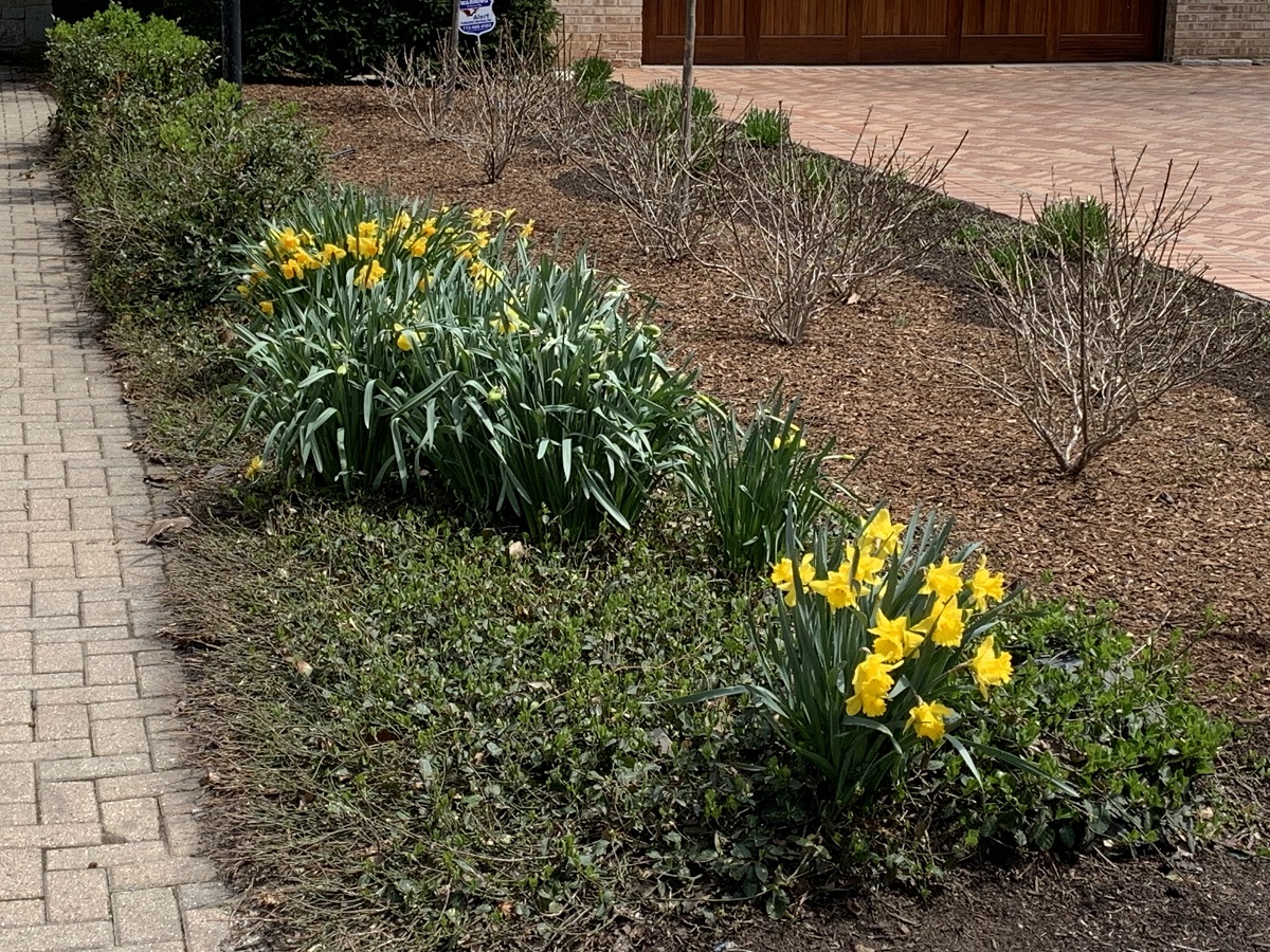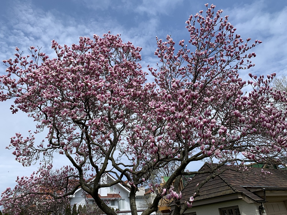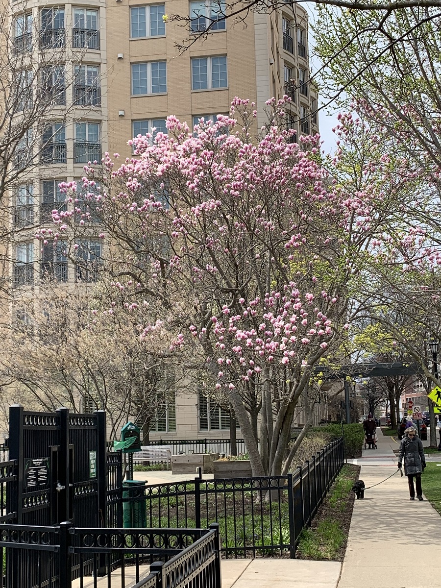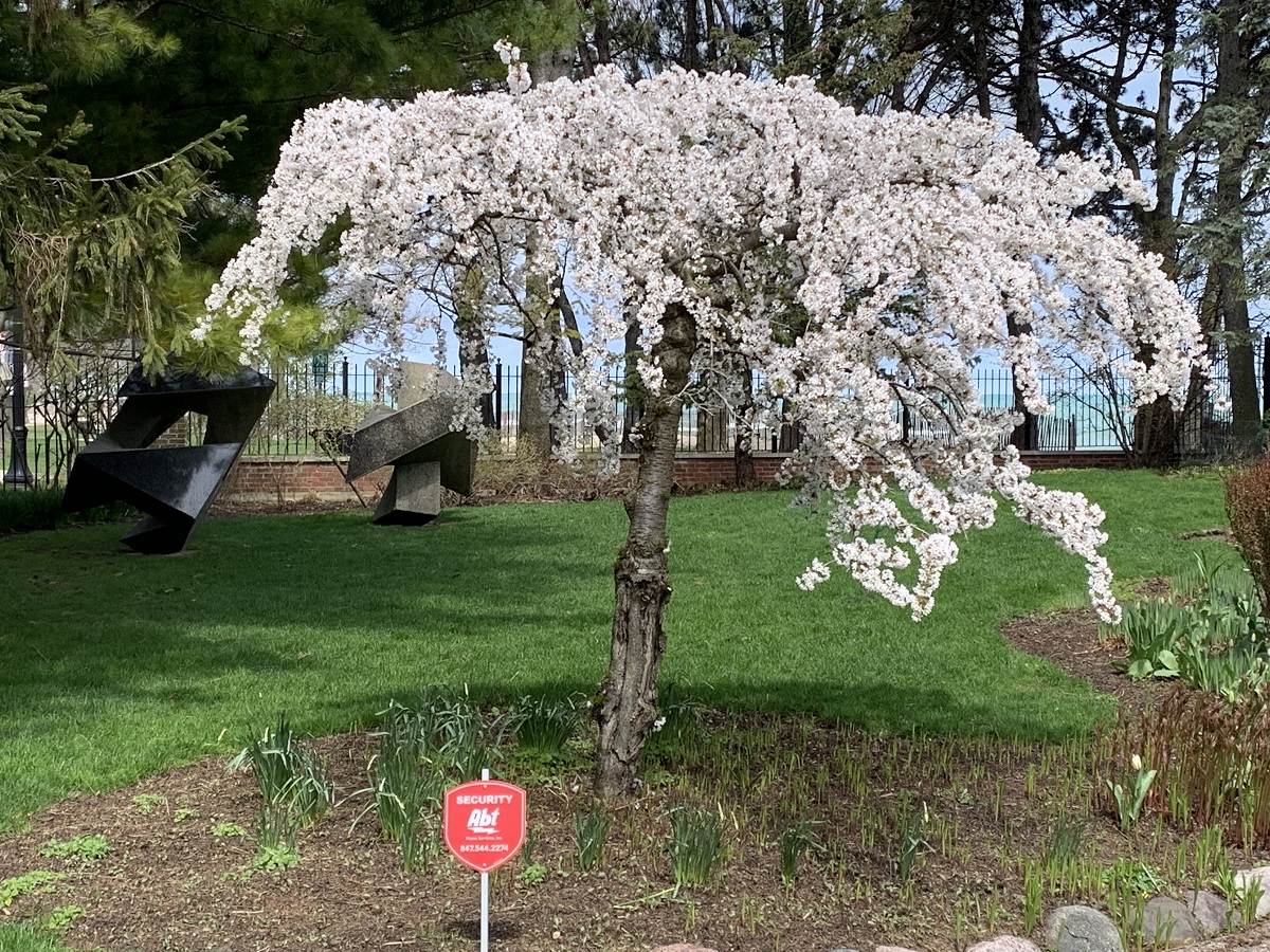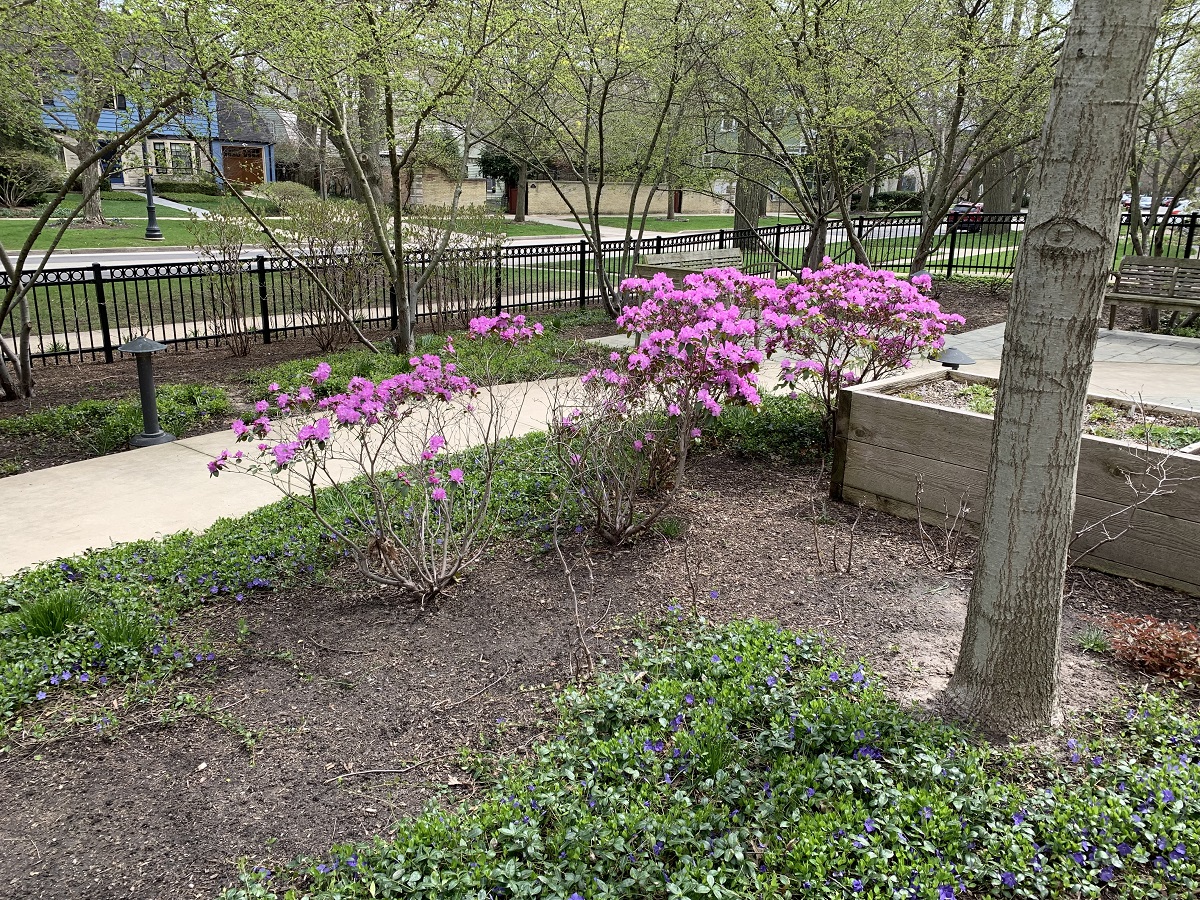 Purple flowers and two lobe speedwell (small blue) in south Mather garden where the UCE Proximity Group meets in summer warm weather