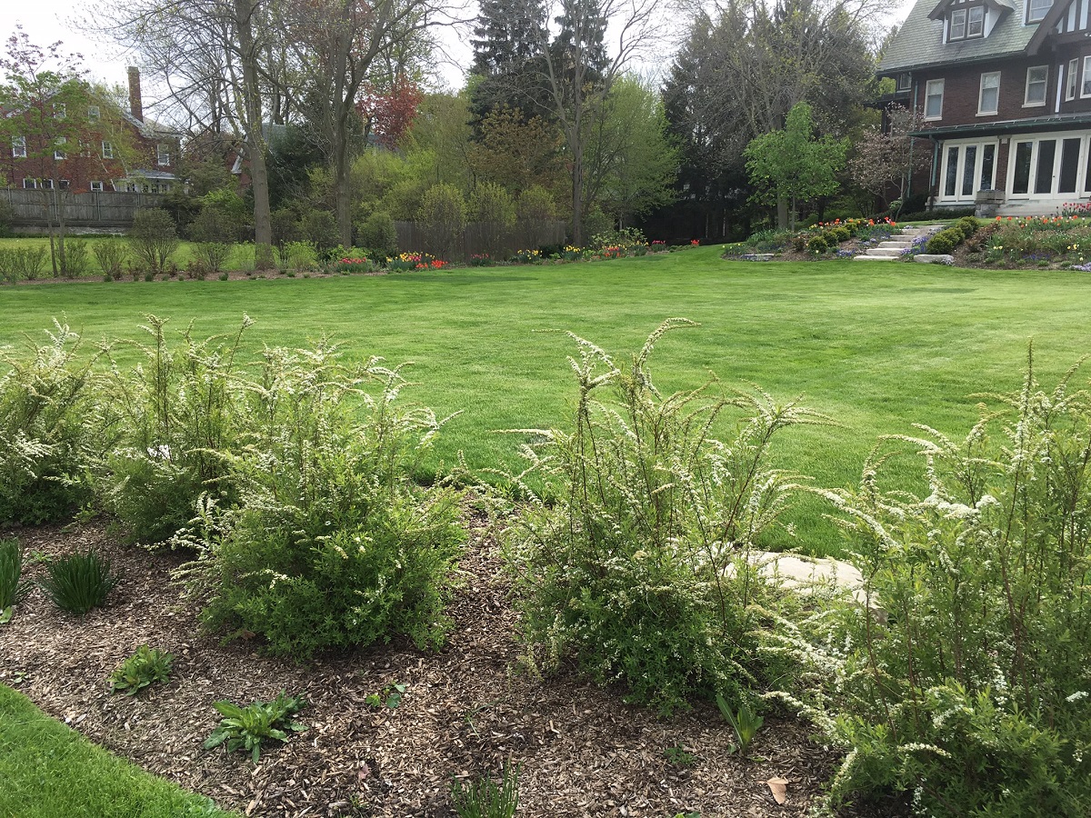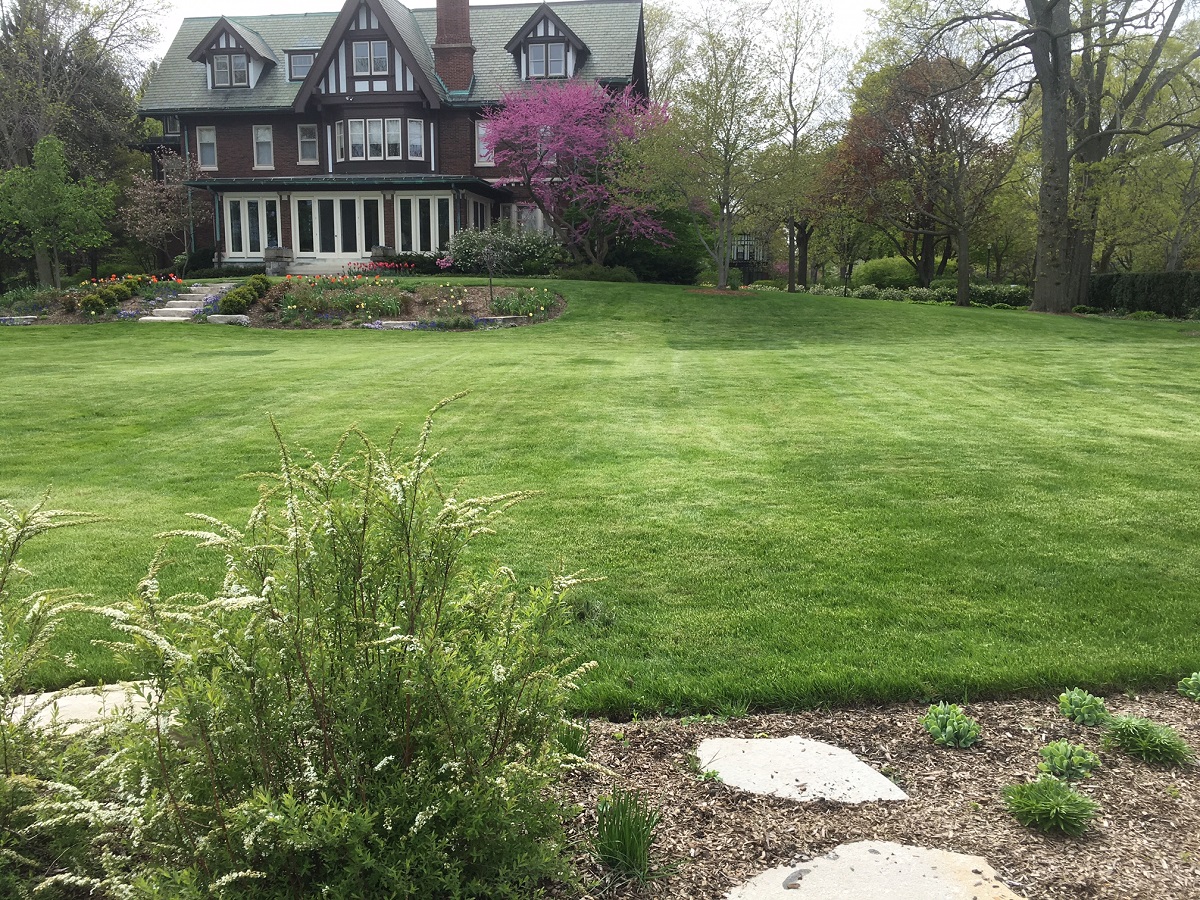 Looking west at that mansion showing many tulips and redbud tree