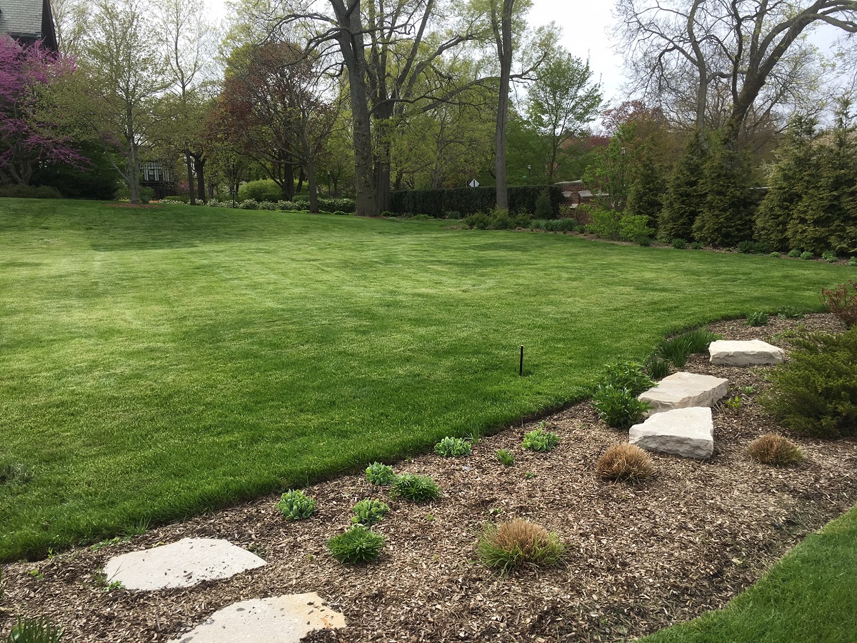 Looking northwest at that mansion showing a little of the redbud, a large lawn, and many green plants to come out later