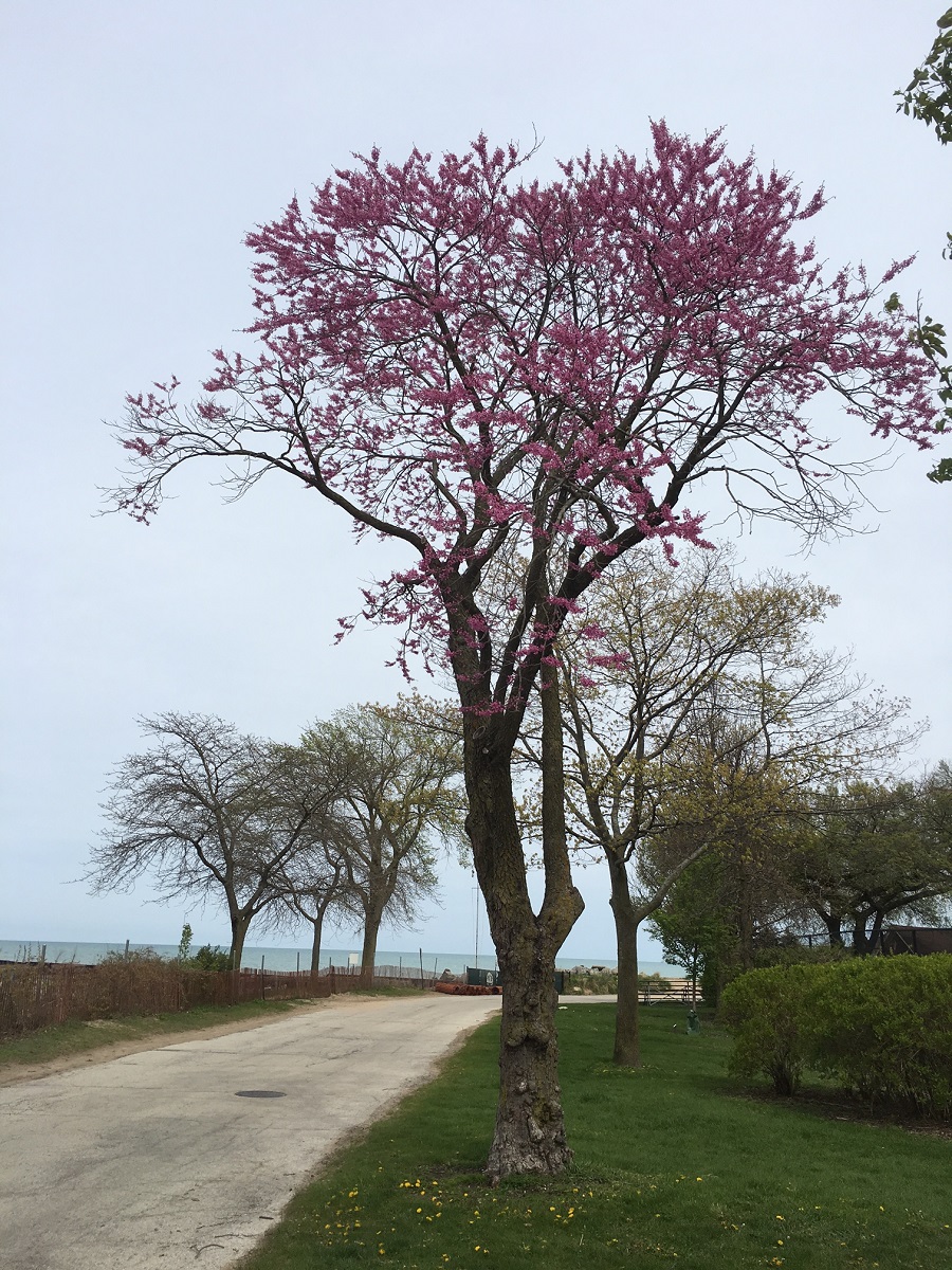 A redbud tree at Dempster by the office and tennis courts