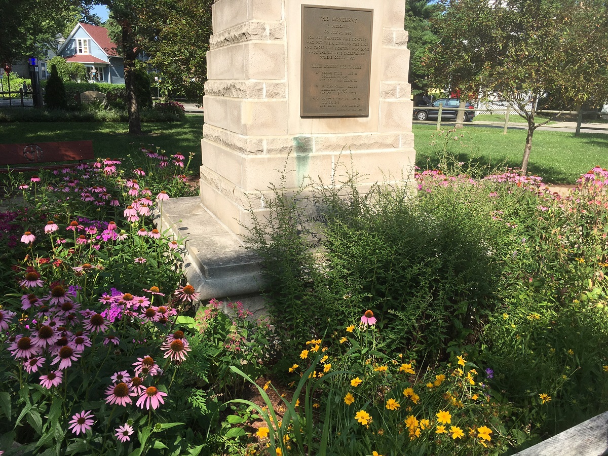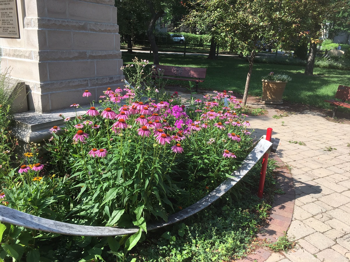 Memorial in Fireman's Park with purple cone flowers all around it