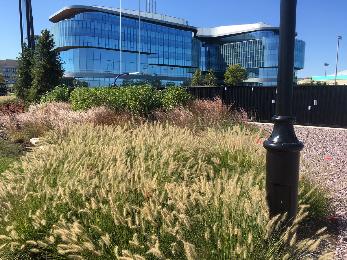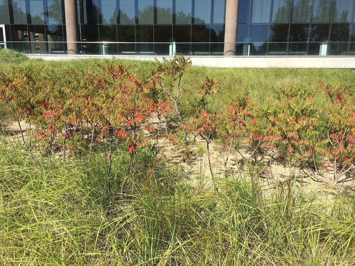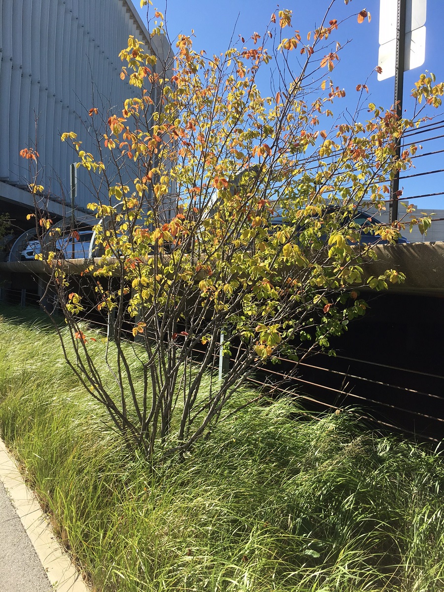 High bush turning yellow and orange by the old double deck parking lot and the new parking garage