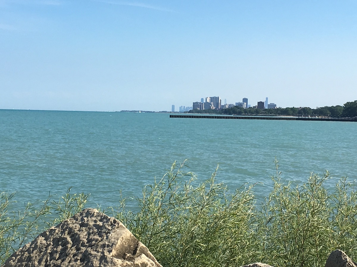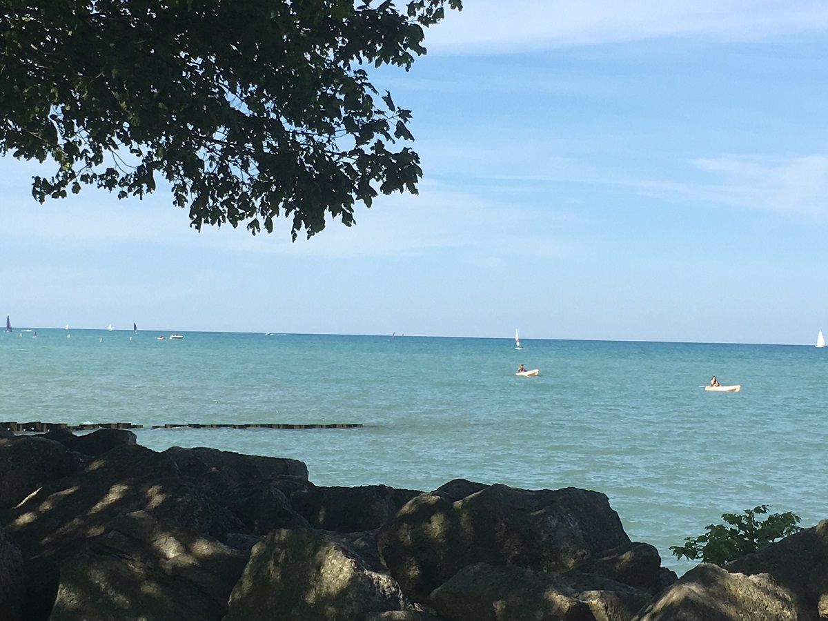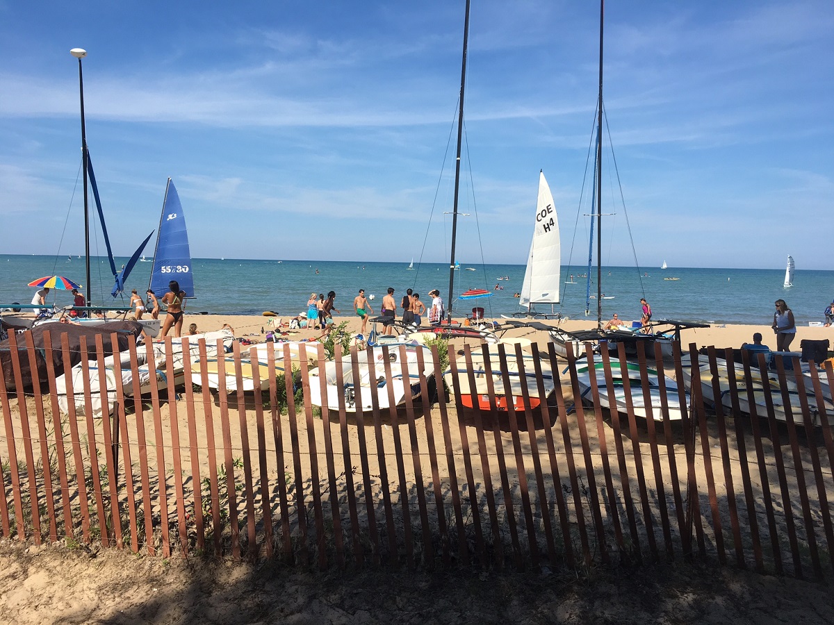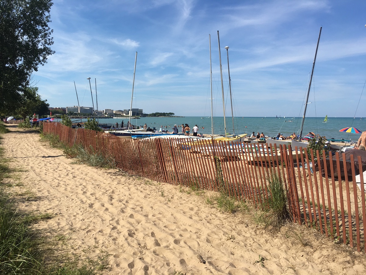 Looking north from Dempster Beach -- both at many boats and the new buildings at Northwestern