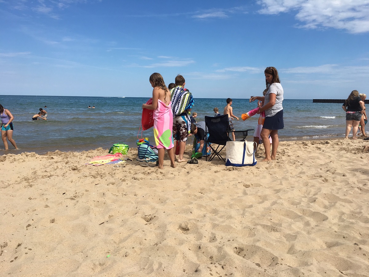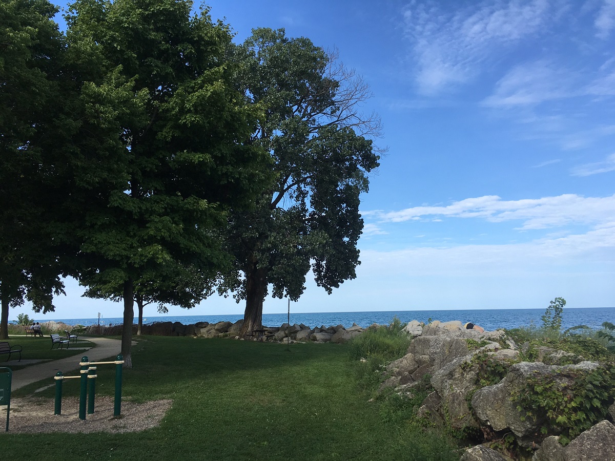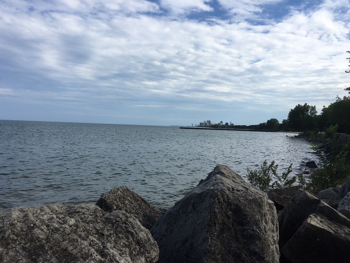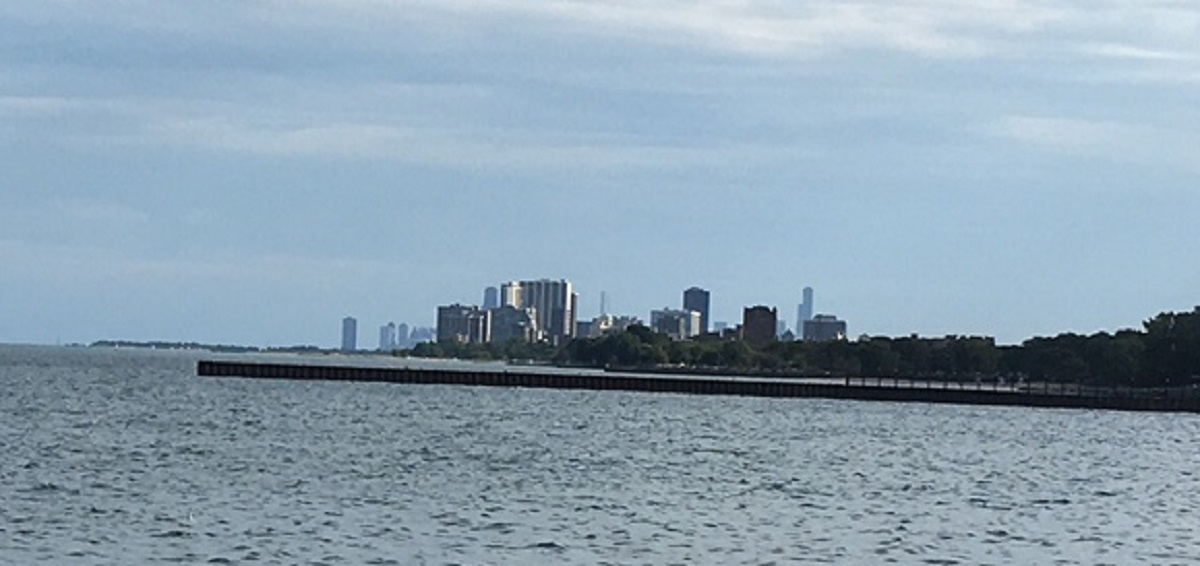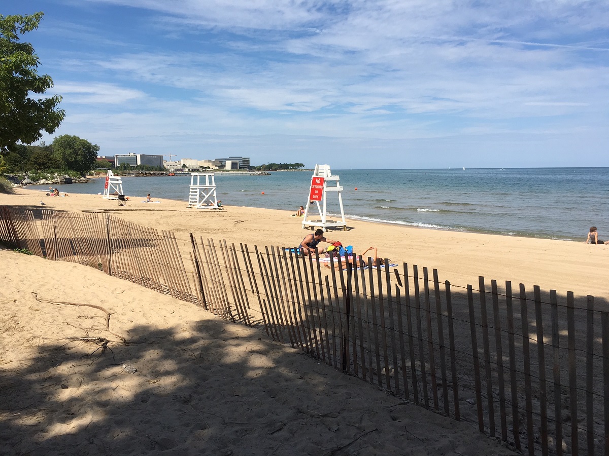 Looking north from Greenwood Beach showing Northwestern landfill and two recent modern buildings at the south end