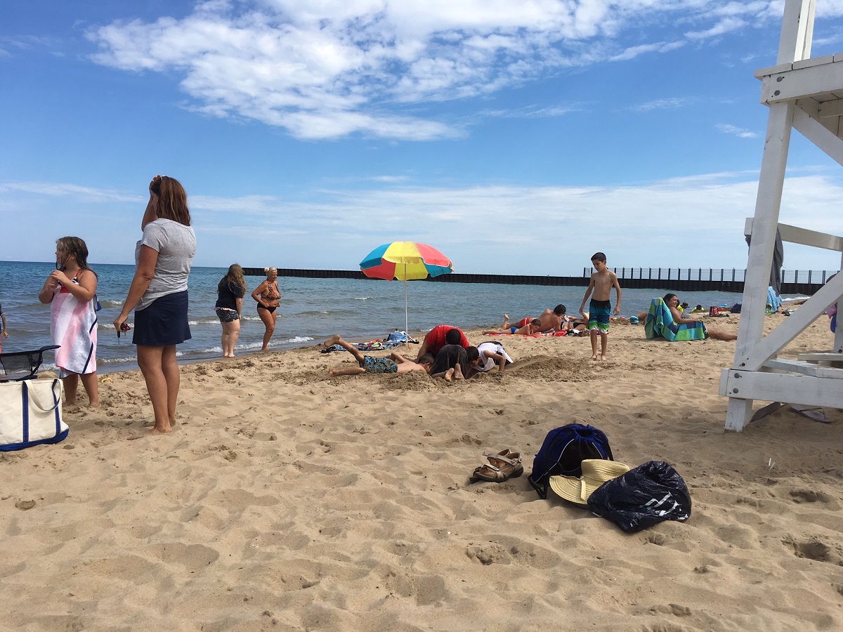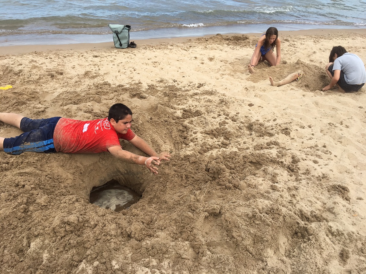 Boy in red on Lee Beach with his large hole down to water and others covering another boy with sand