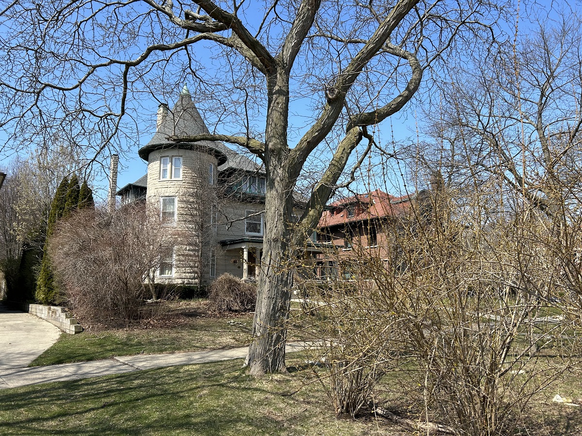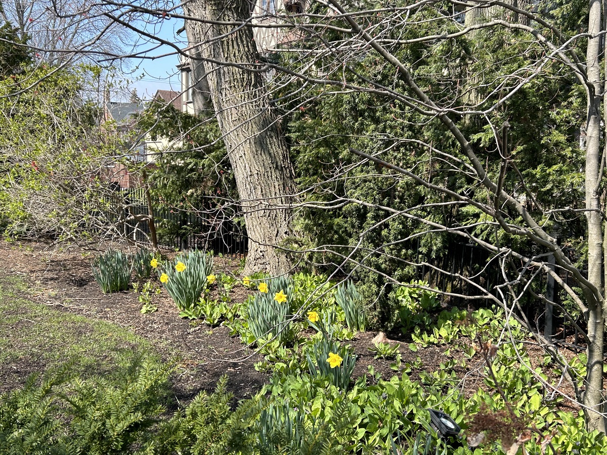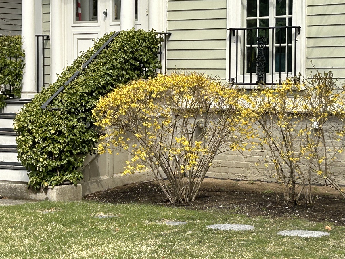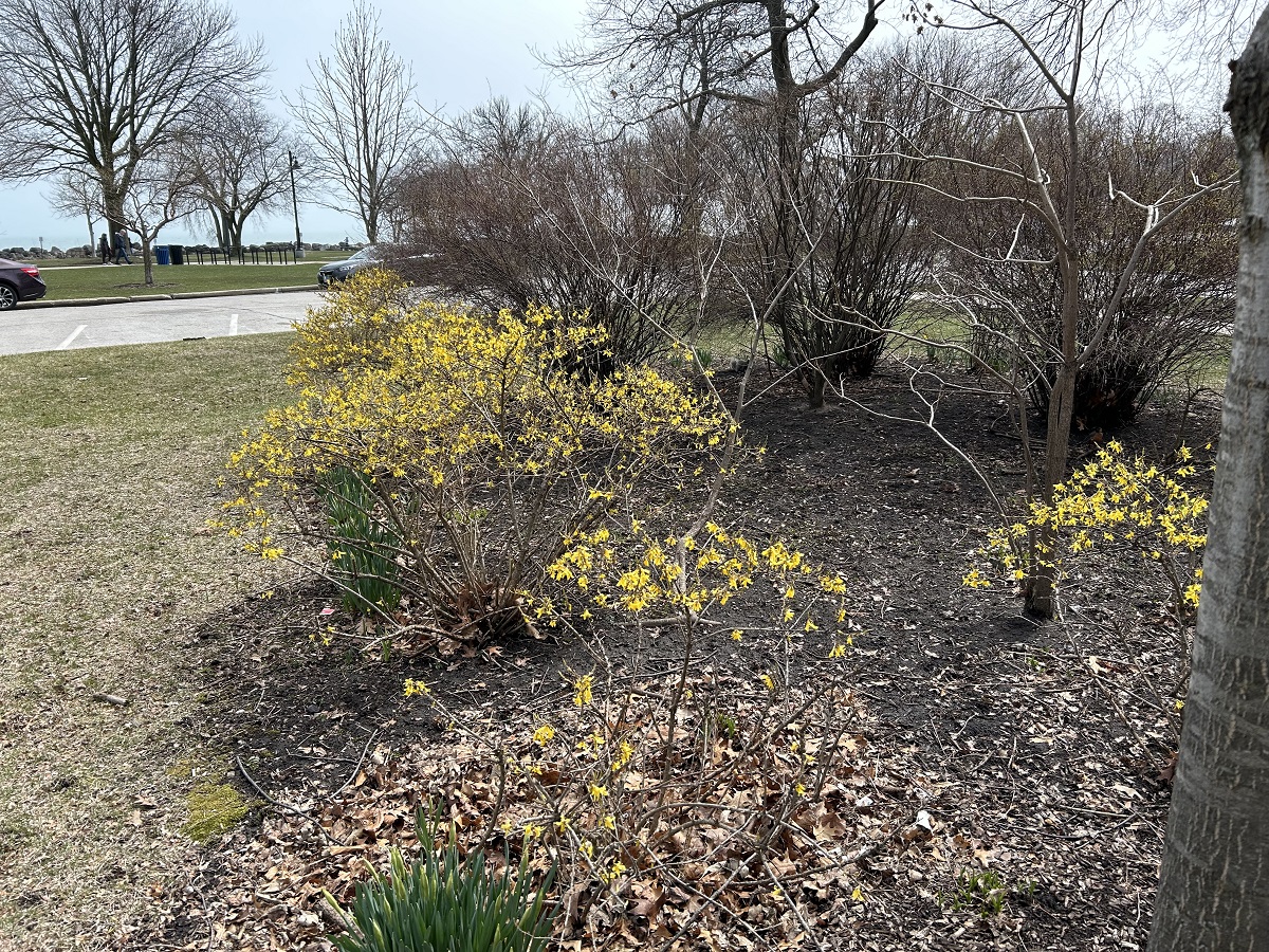 Beginning of magnolia and end of forsythia by "castle" condo west of Lee Beach