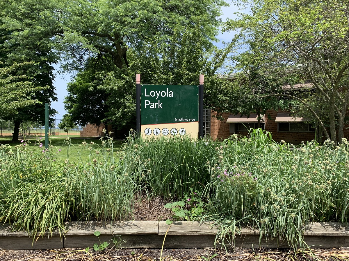 Flowers and sign for Loyola Park