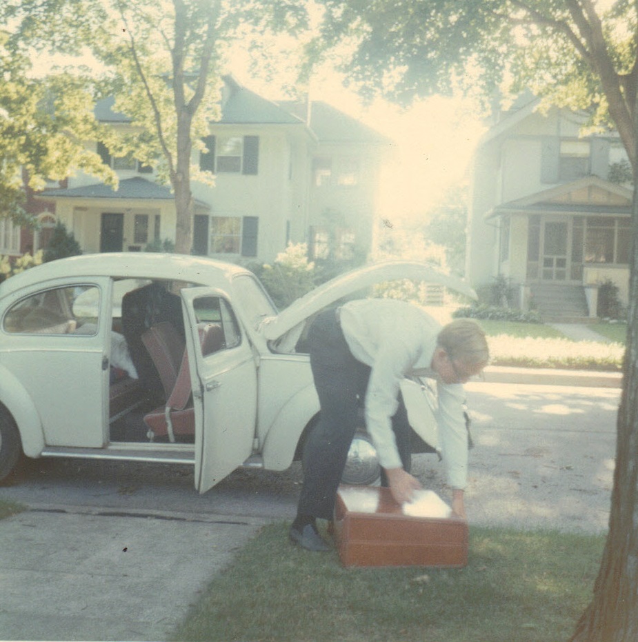 Andy loading his new VW beetle to go off to Rose Tech