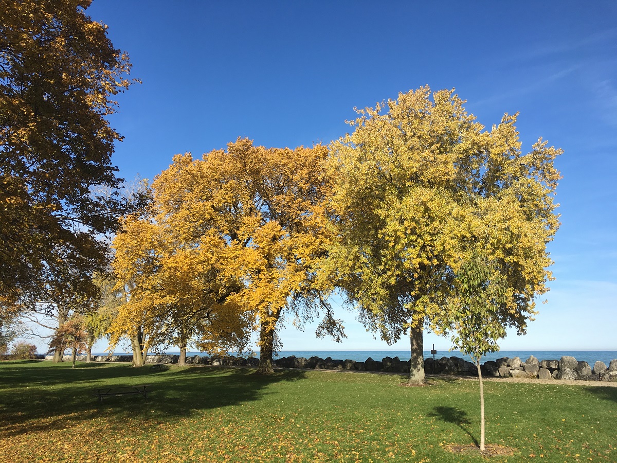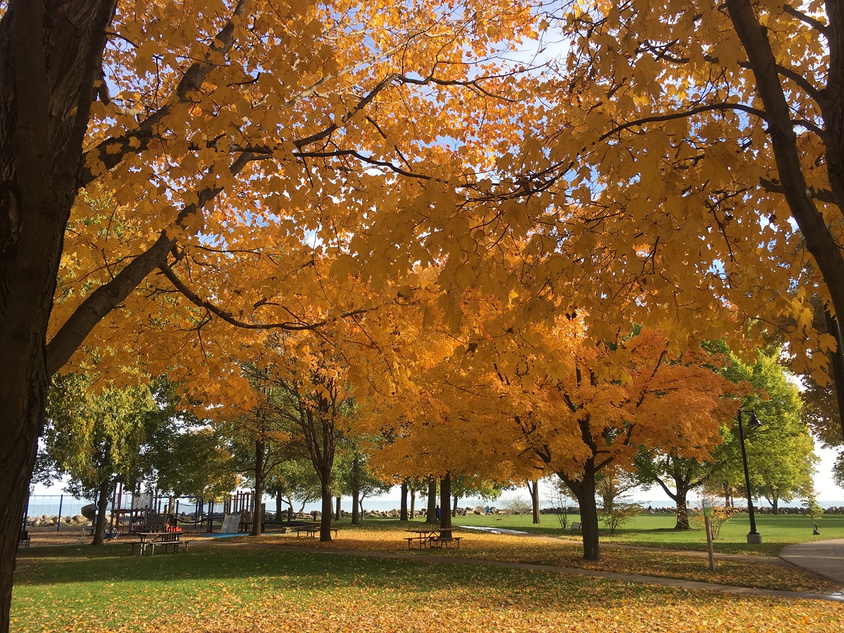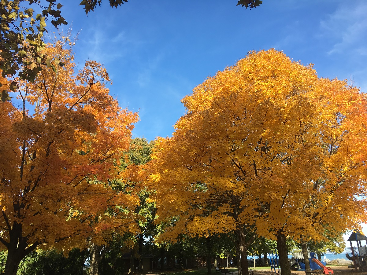 Bright yellow trees by playground just south of Dempster Street