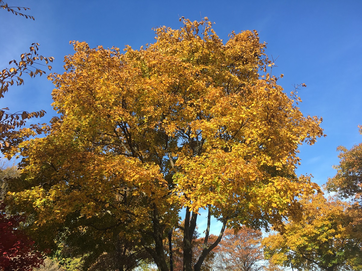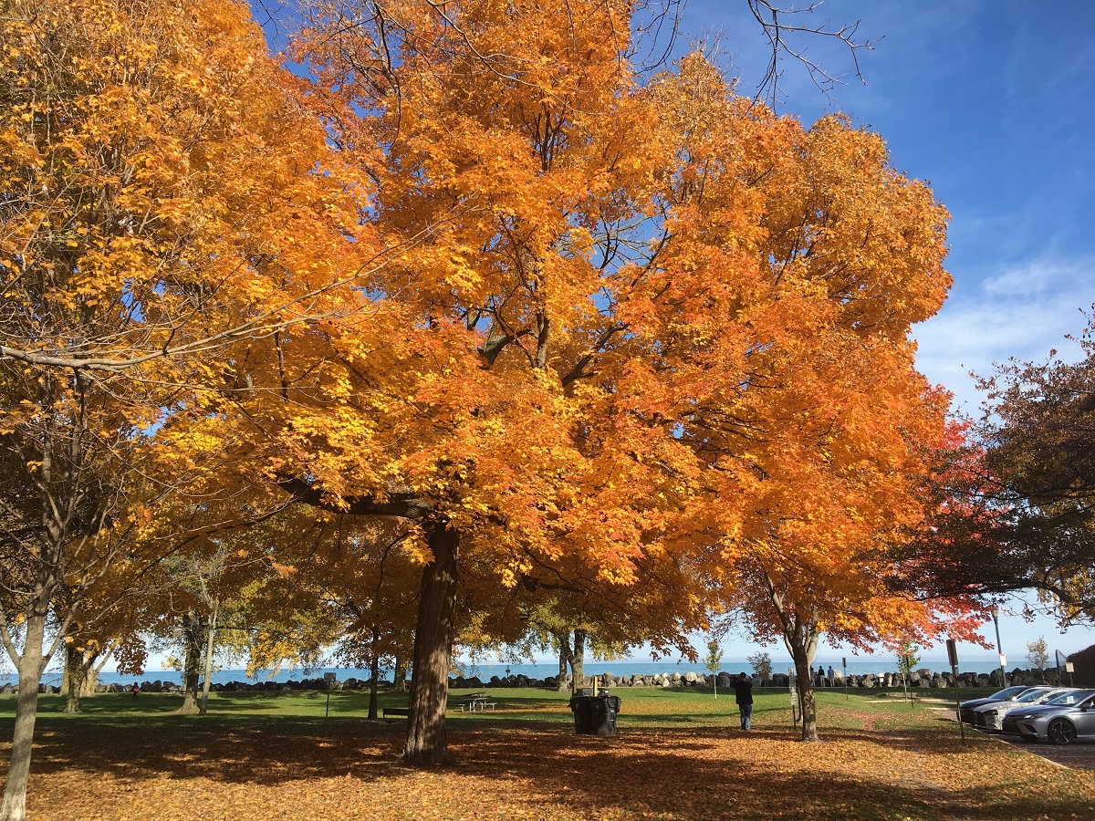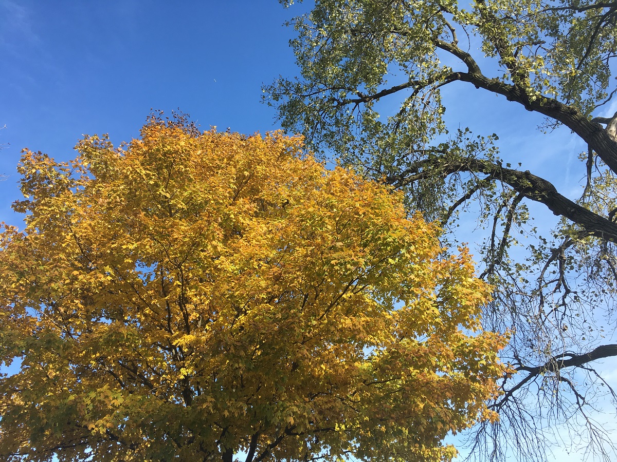 Yellow tree by tall cottonwood tree between Dempster and Lee Beaches