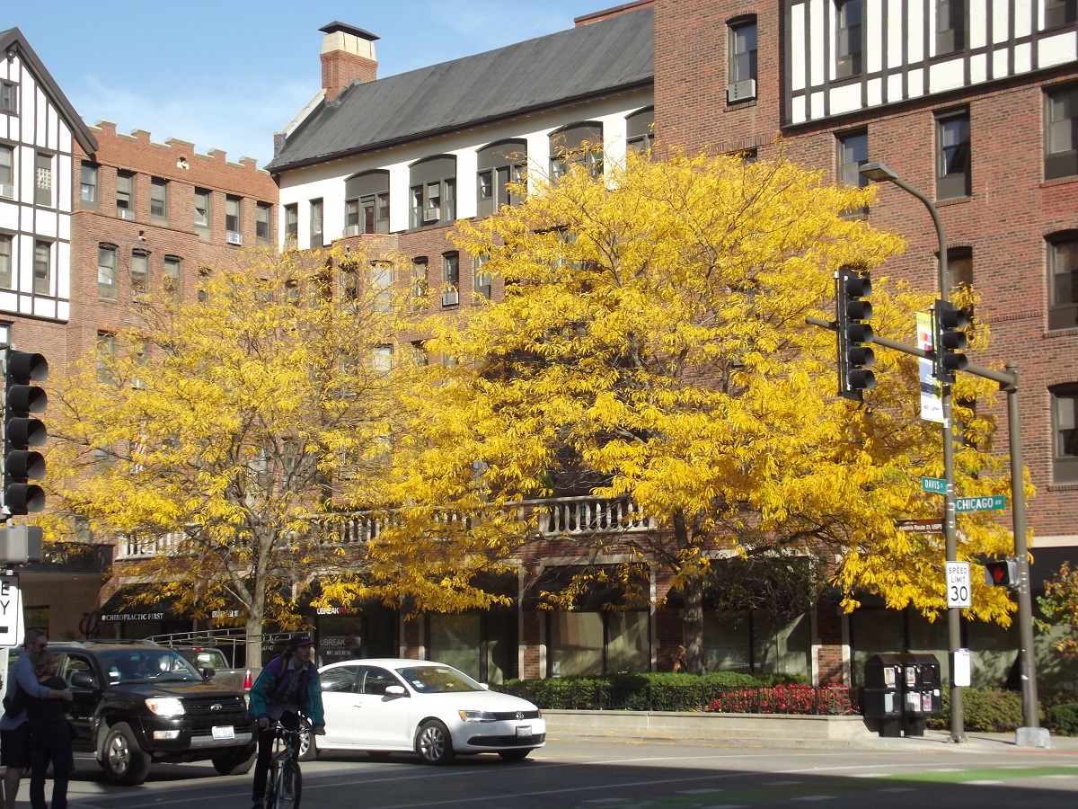 Yellow locust trees at Chicago Ave. and Davis St in front of (former) North Shore Retirement Center