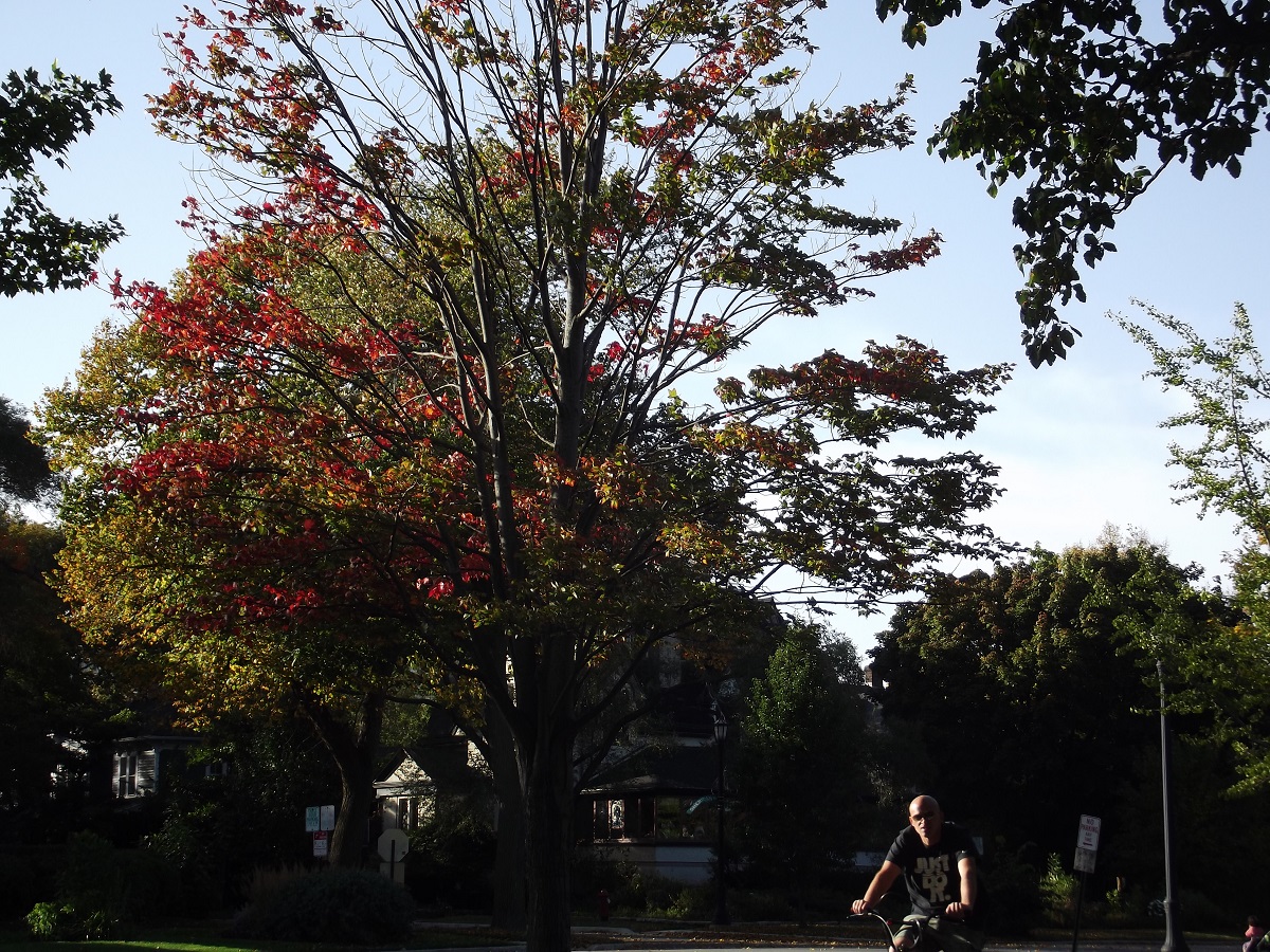 Red maple tree with guy biking south on lakefront trail
