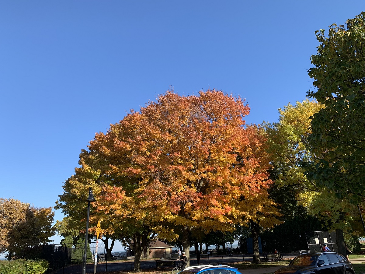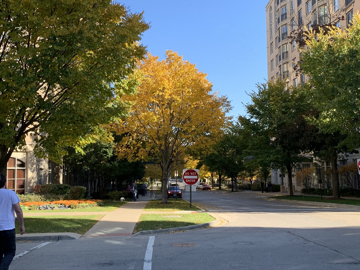 Yellow maples looking east down Davis by Mather -- 10/22/22
