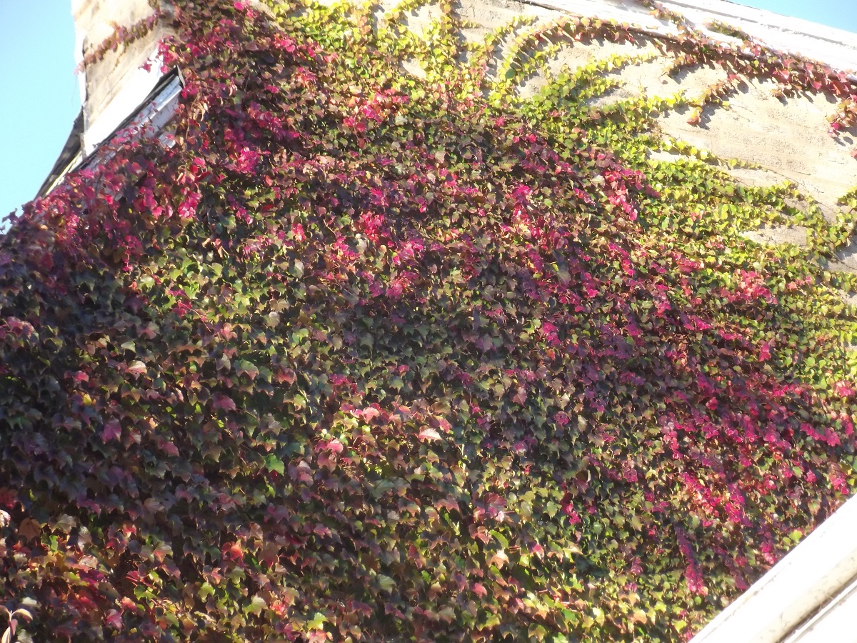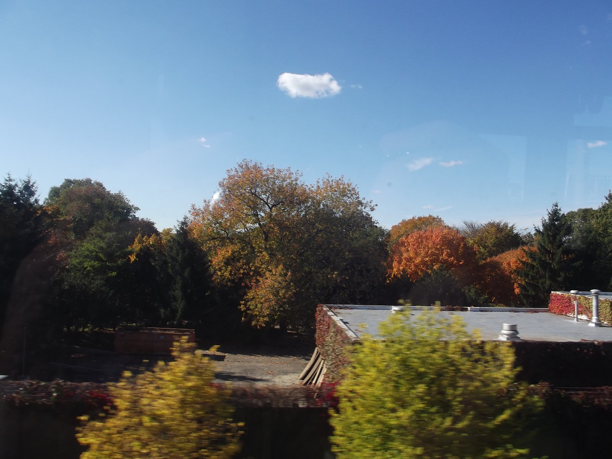 Several colorful trees and red ivy from train at Graceland Cemetary