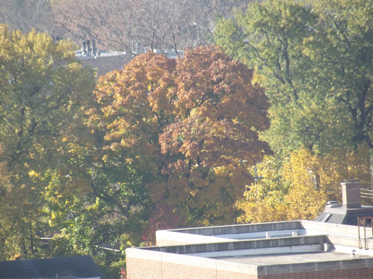 Telephoto of orange and yellow trees from balcony
