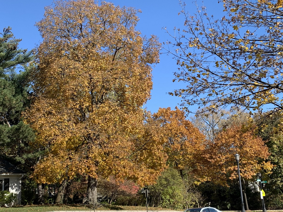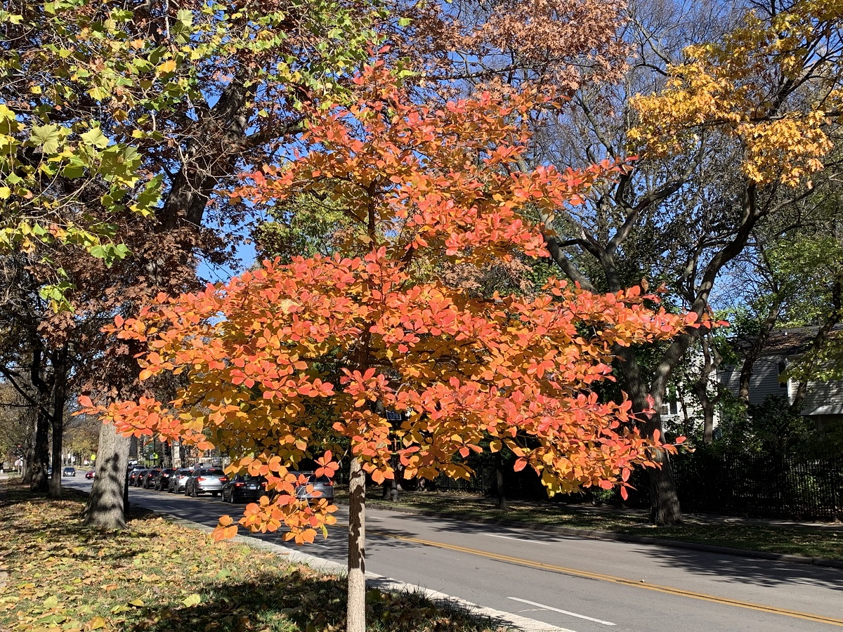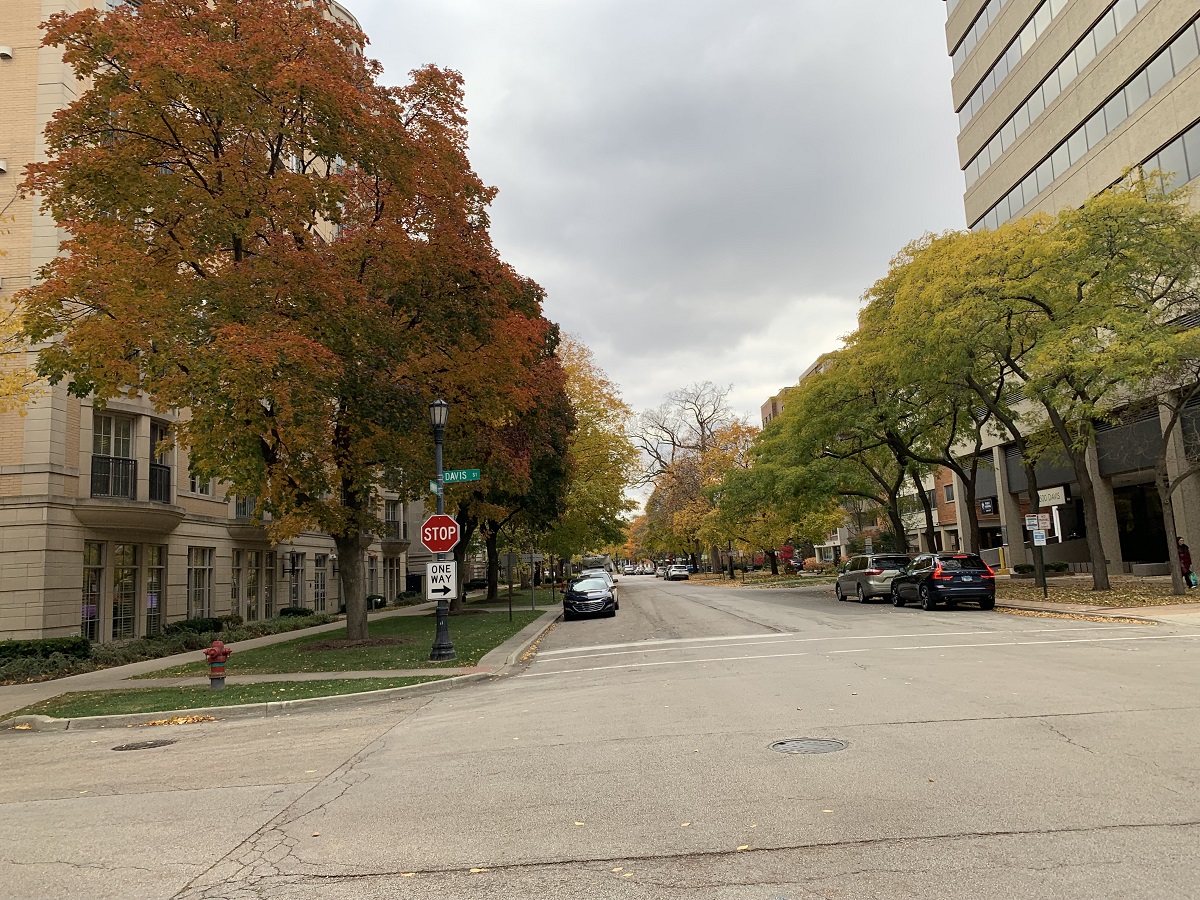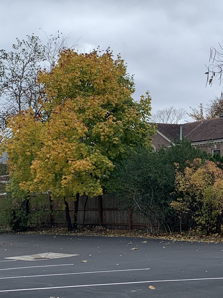Dark purple and yellow trees at Lake and Oak by "castle" condo tower