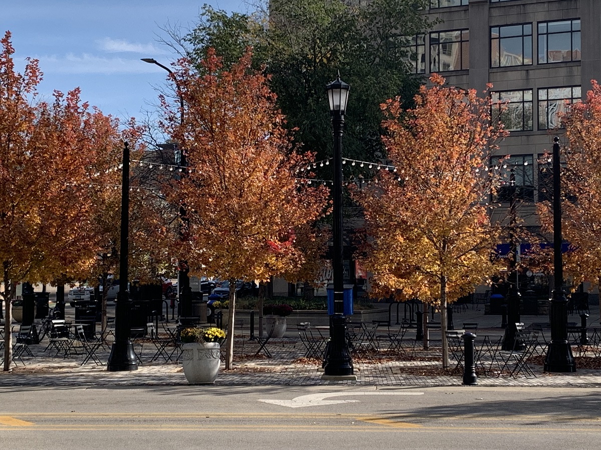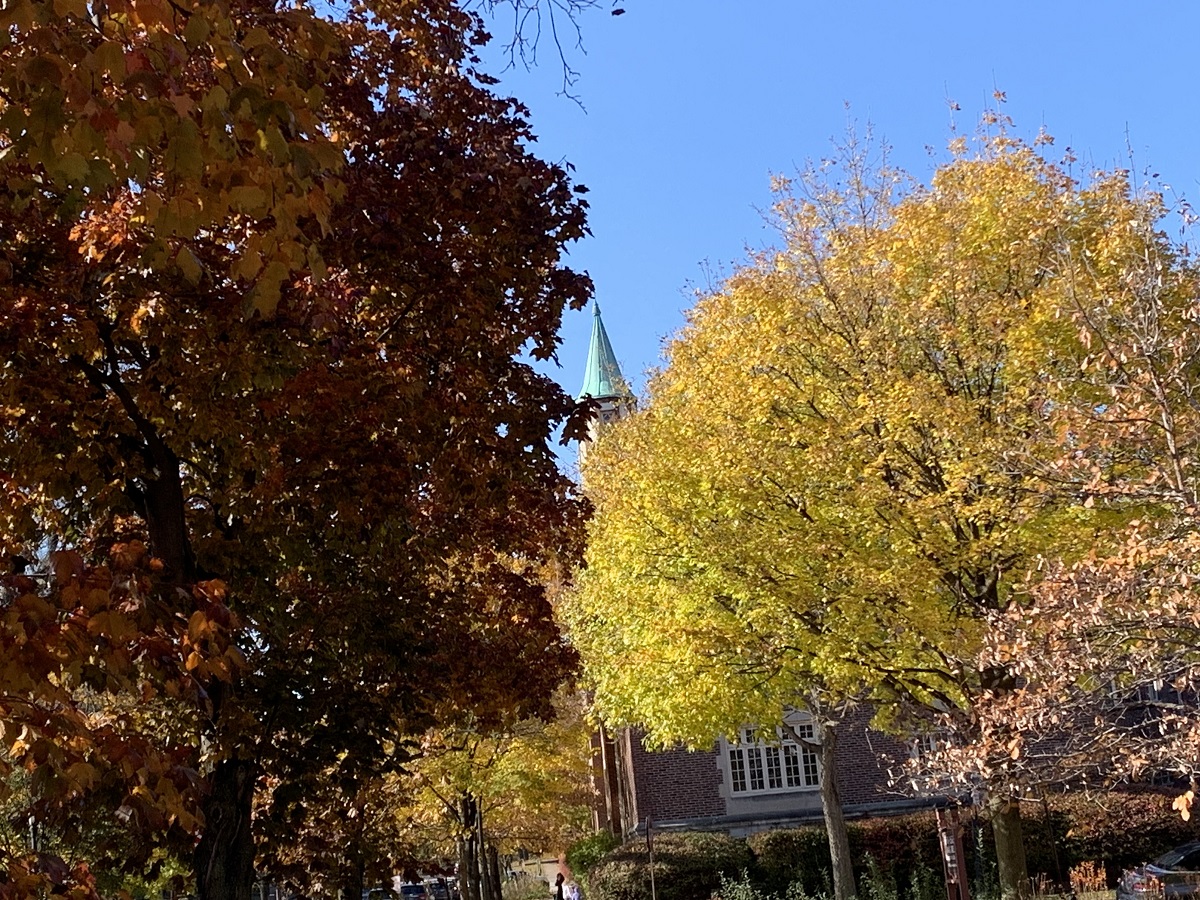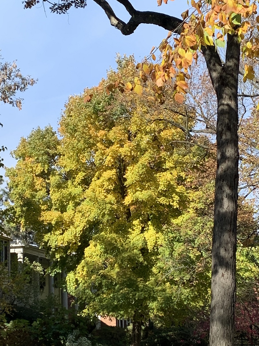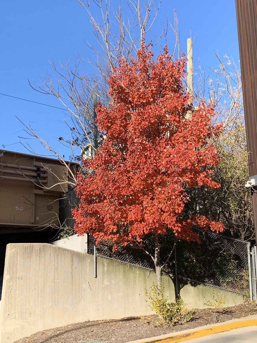 Dark purple and yellow trees at Lake and Oak by "castle" condo tower