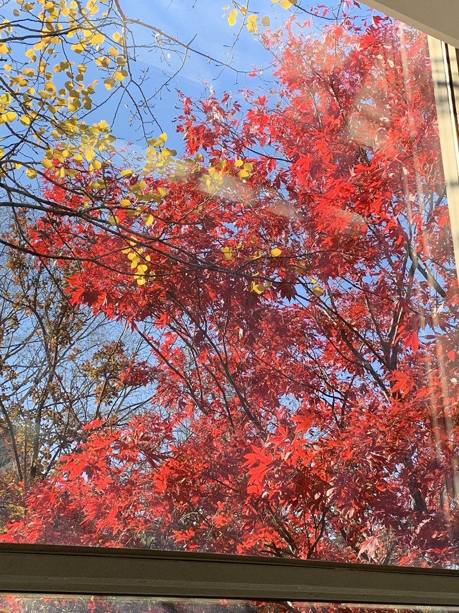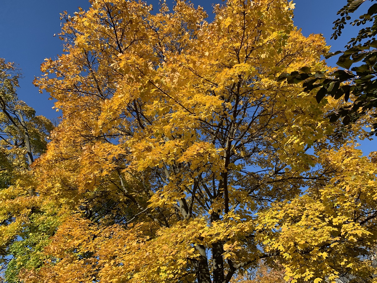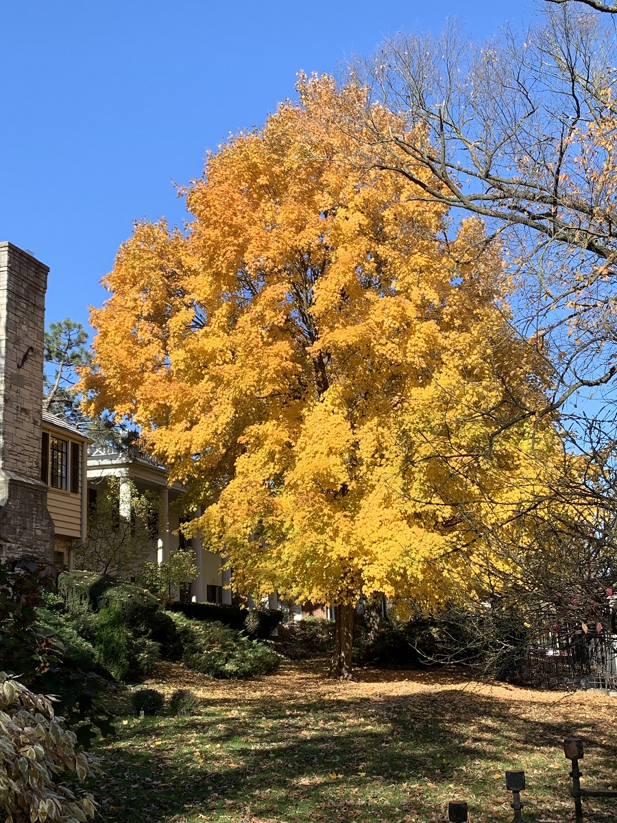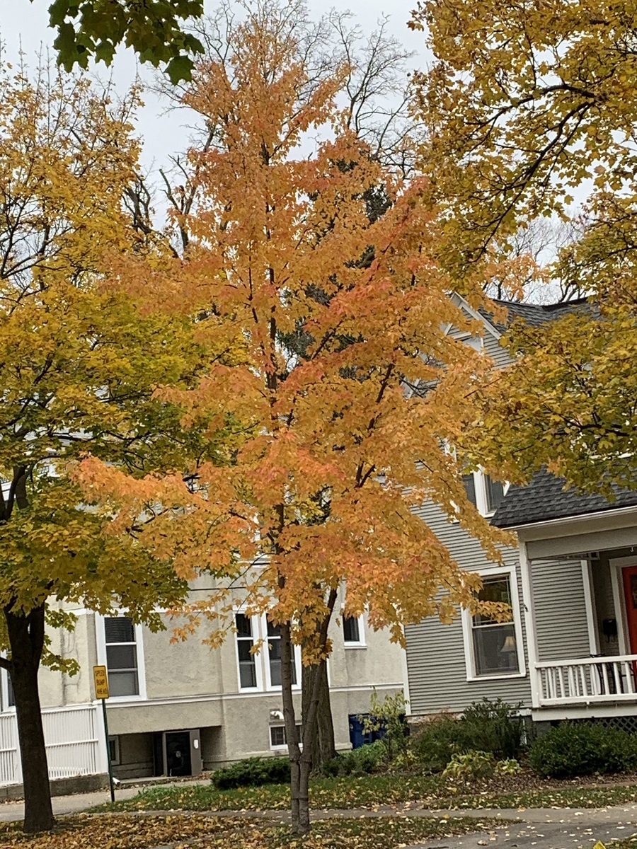 Dark purple and yellow trees at Lake and Oak by "castle" condo tower