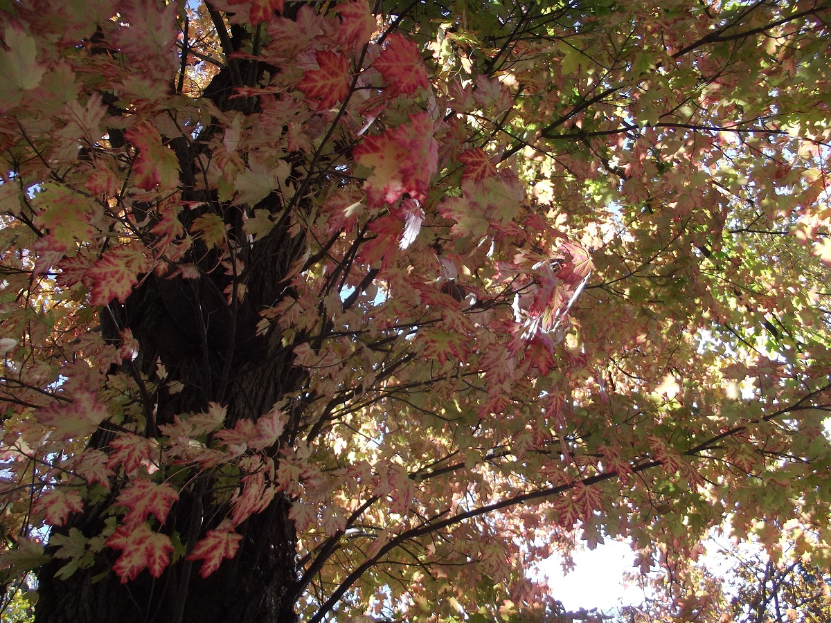 Back-lit yellow maple by rose gardens