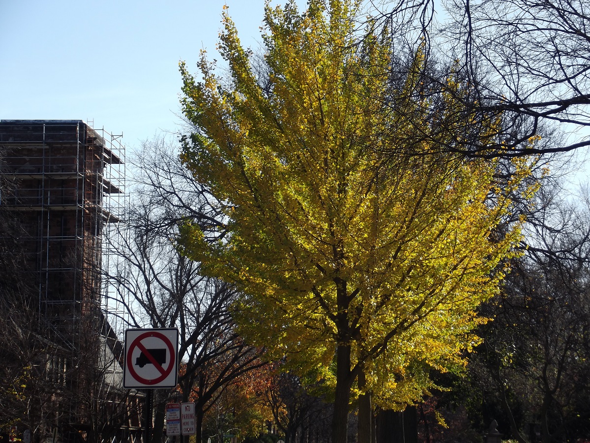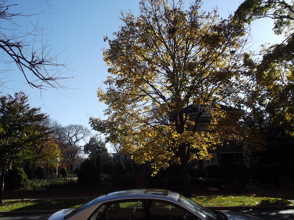 Back-lit yellow trees along Oak south of Lake