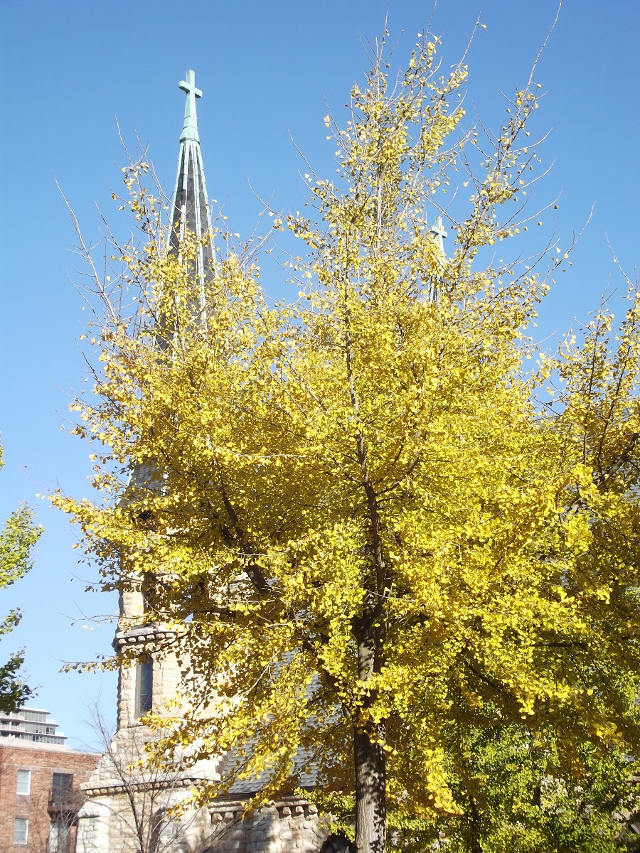 Back-lit yellow trees along Oak by Rose Garden and St. Mary's Catholic Church