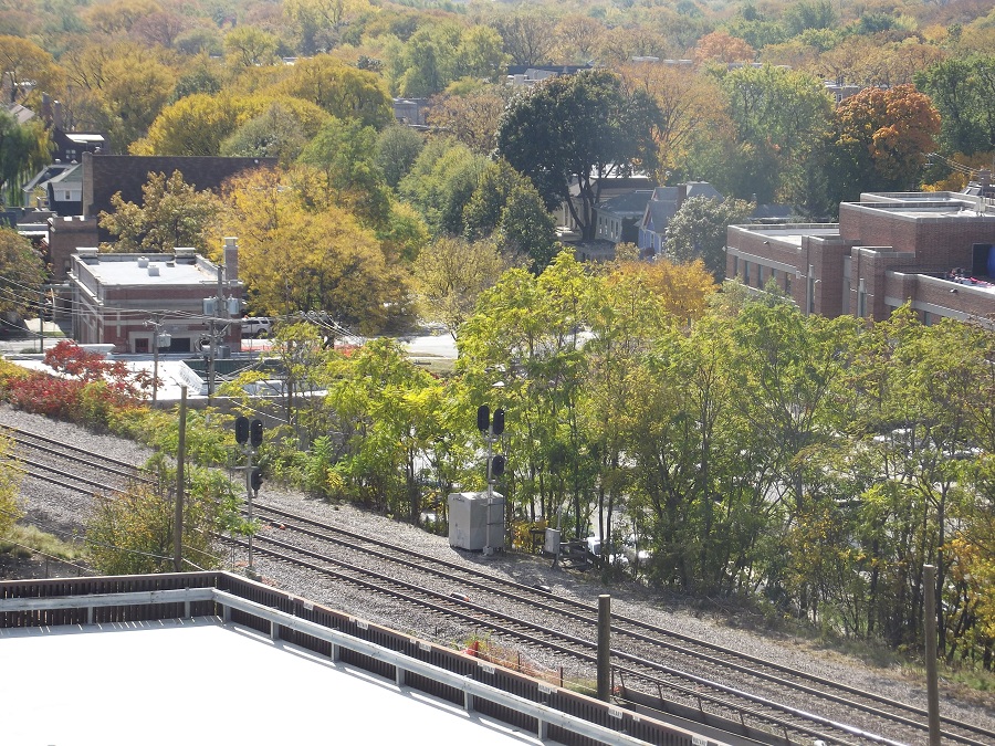 Red and orange trees on former Kendal College site -- along Sherman one block south of Lincoln