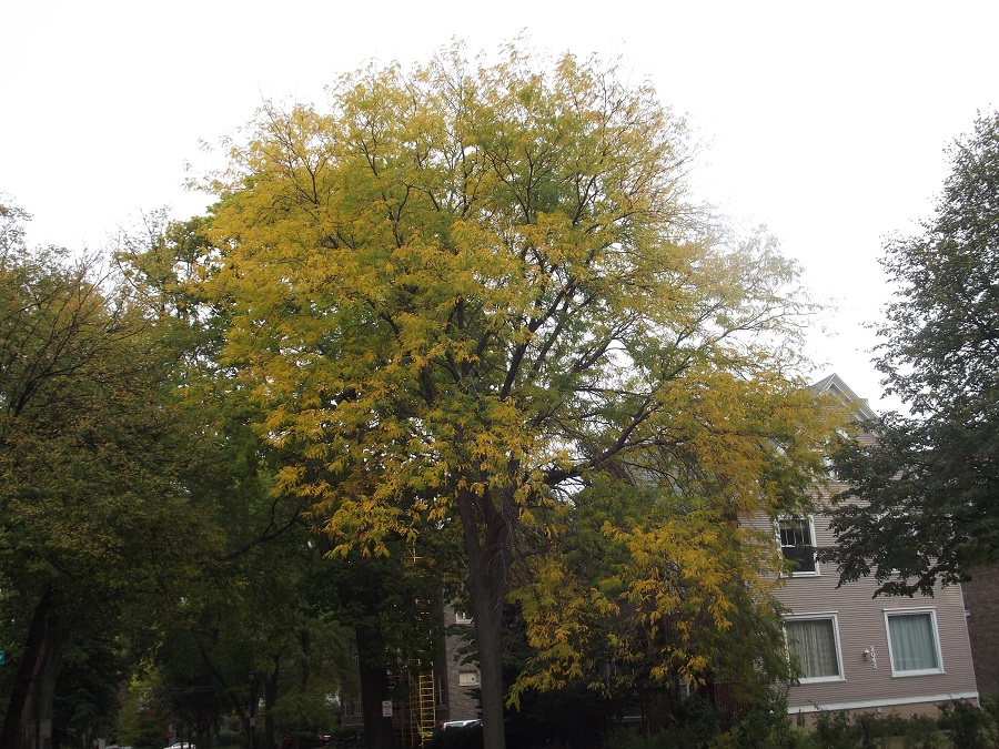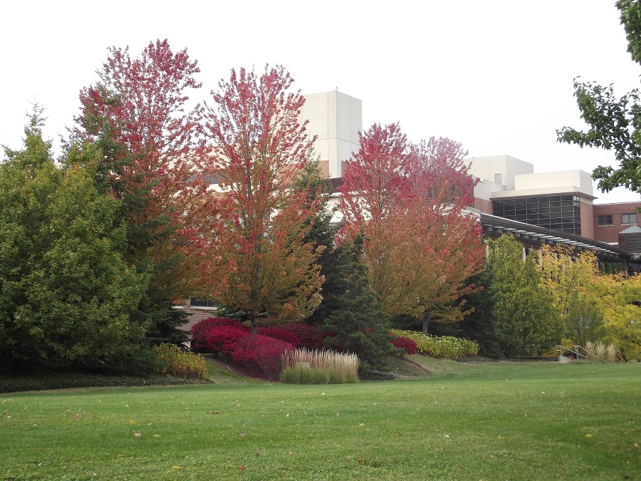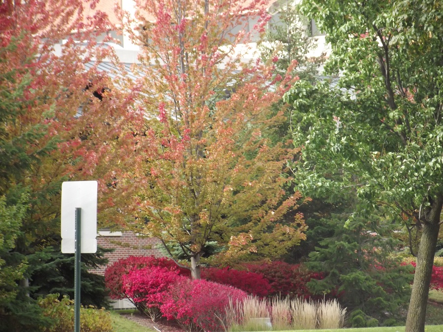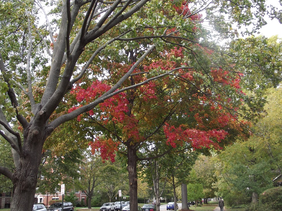 Red and orange trees on former Kendal College site -- along Sherman one block south of Lincoln