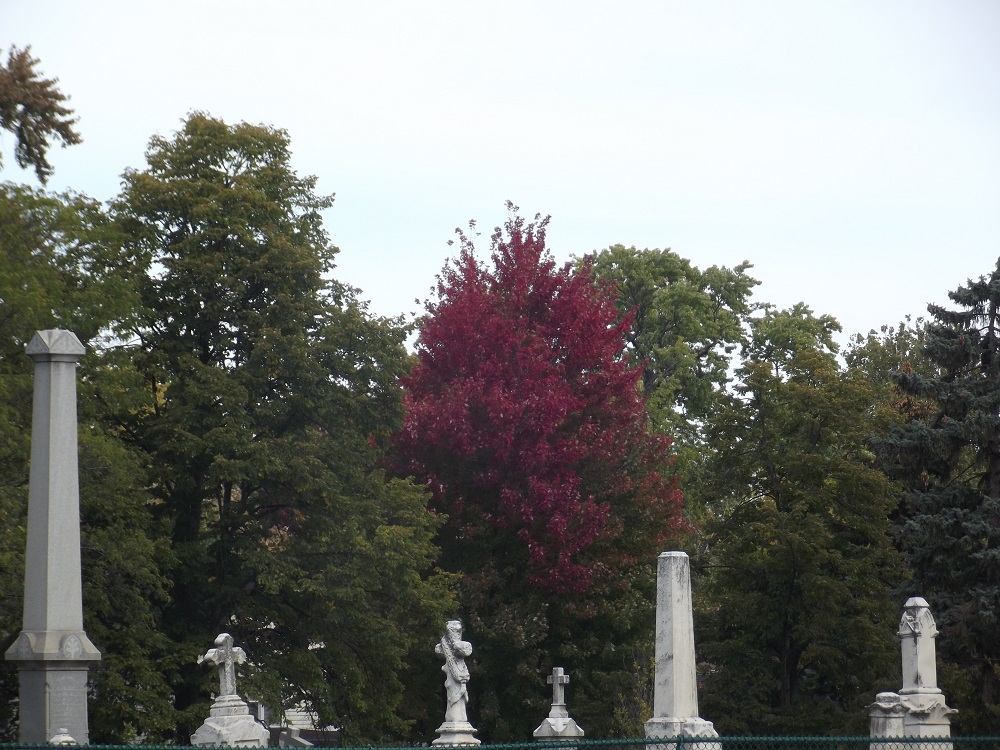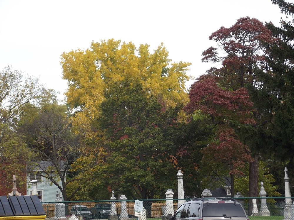 Yellow and dark brown tree in same cemetary