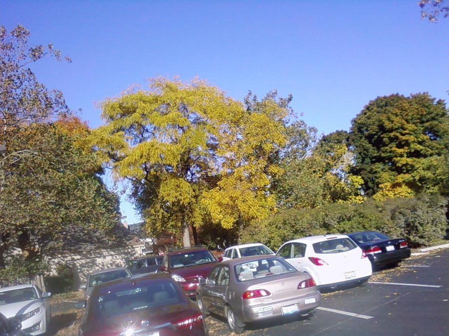 Yellow trees beyond church parking lot -- Sunday 10/26/14