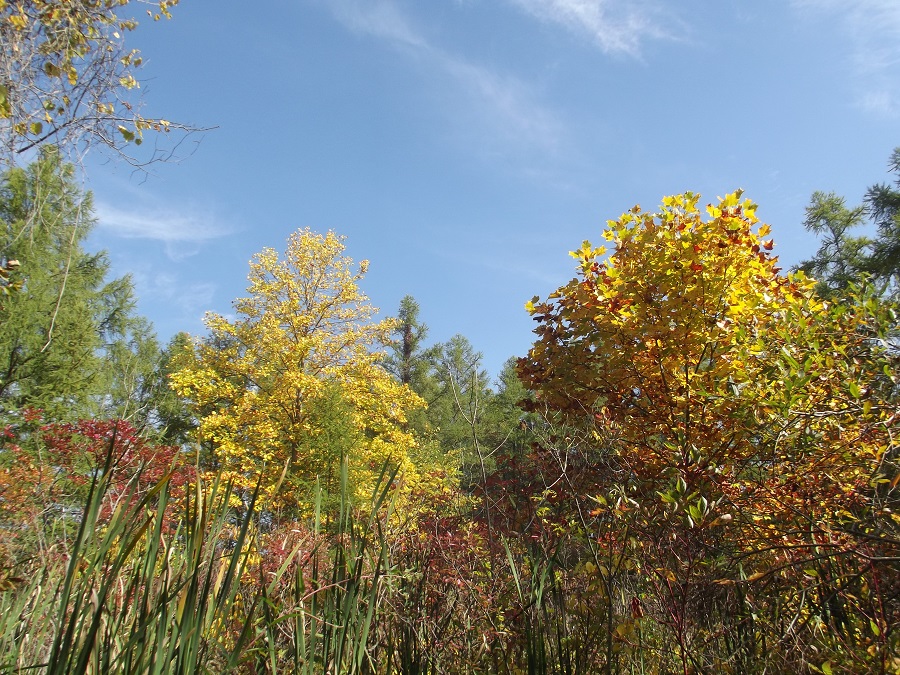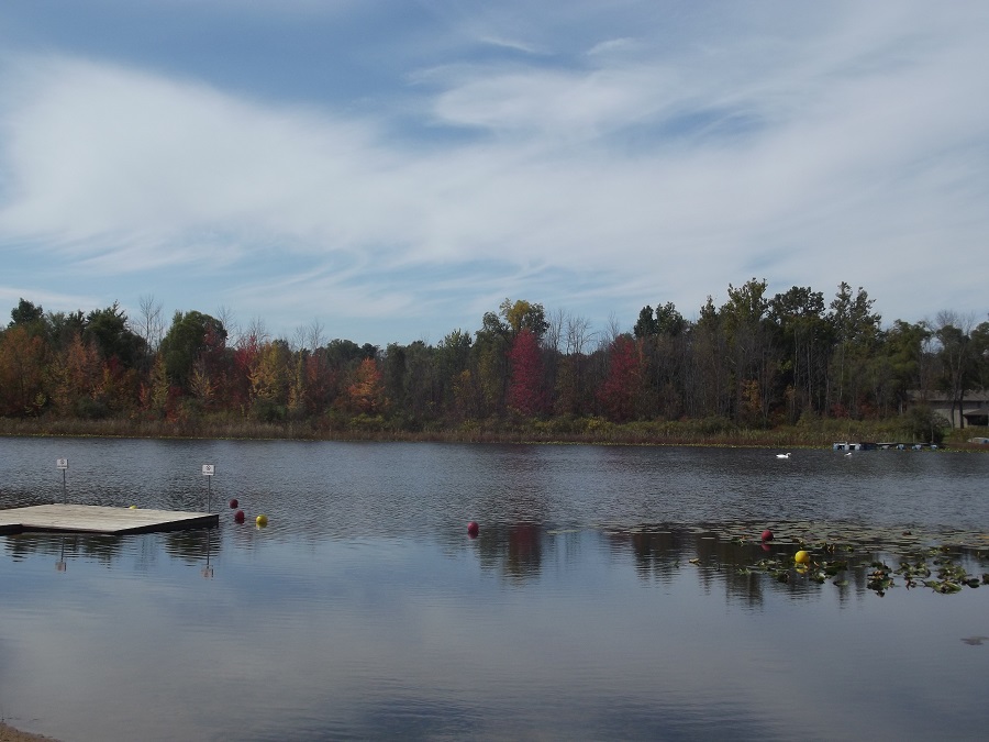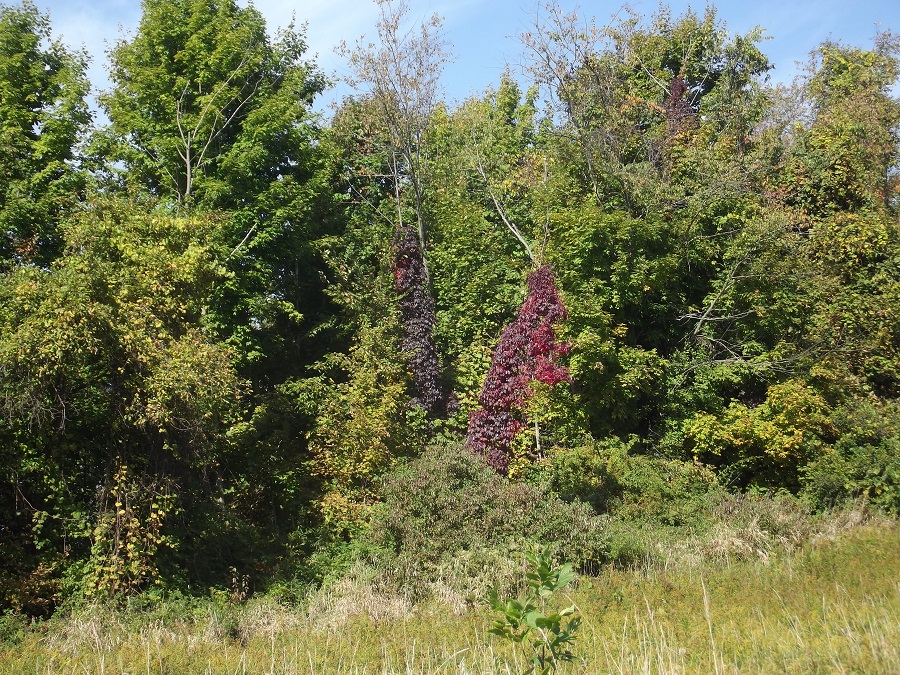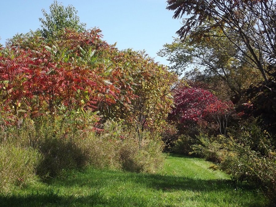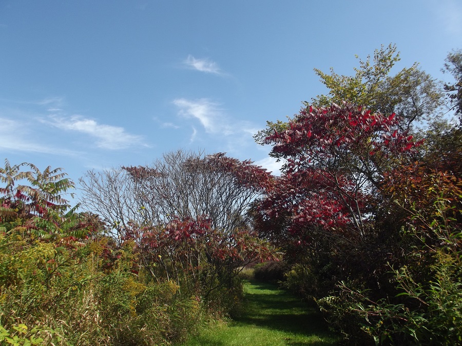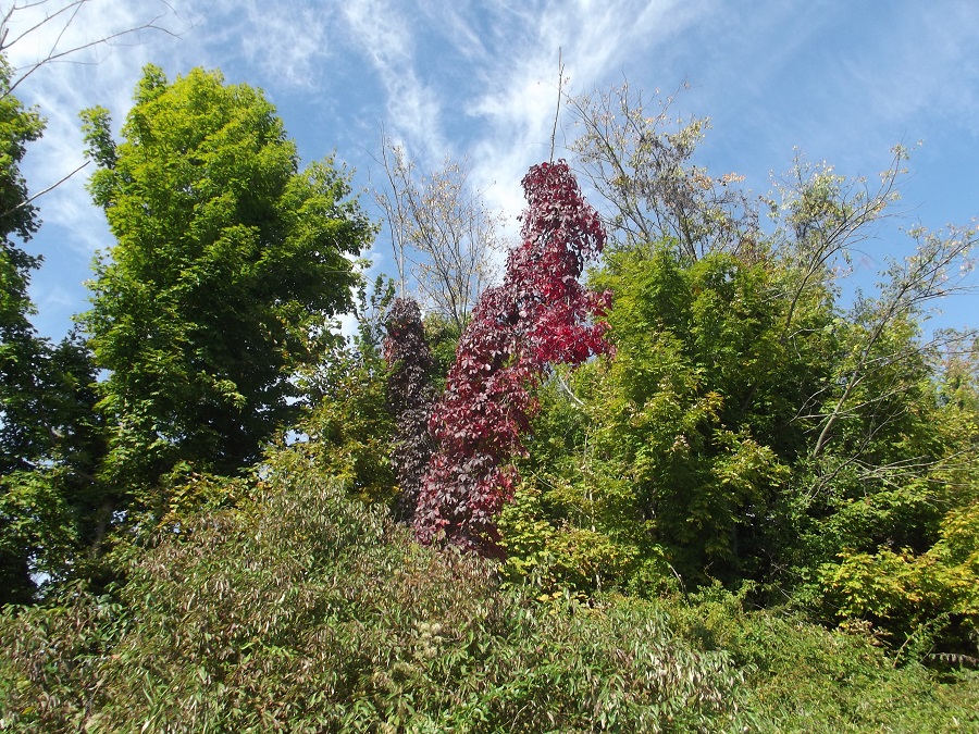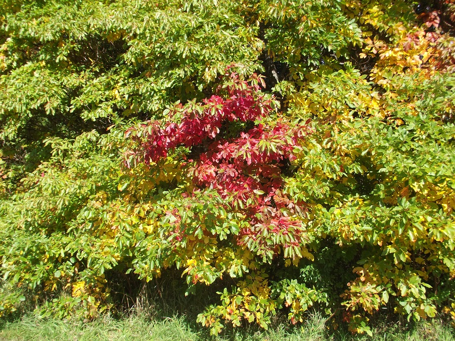Bushes turning red in Optima Towers Courtyard -- Thursday, 9/25/14