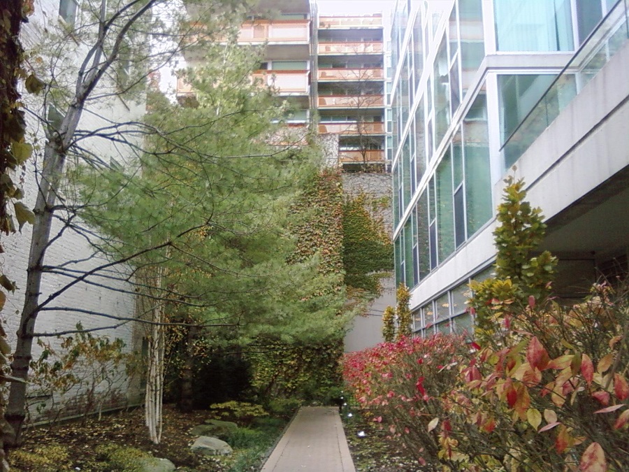 Optima Towers court showing orange ivy and last of red hedge -- Thursday 11/13/14
