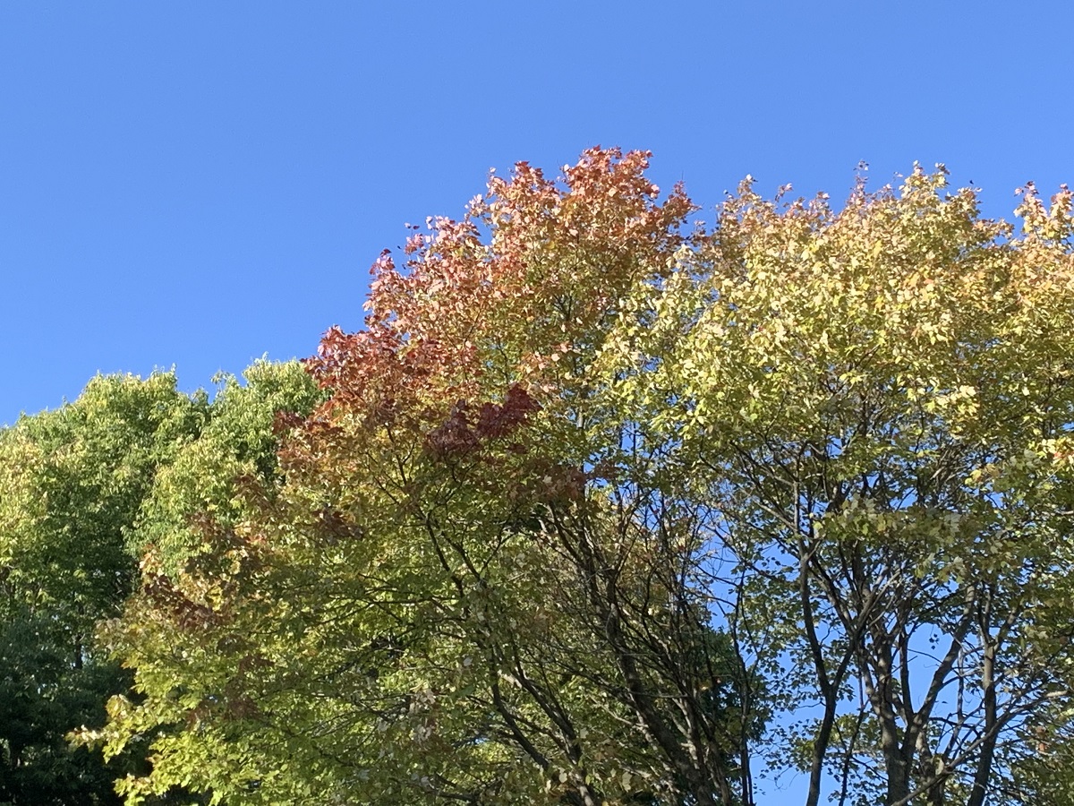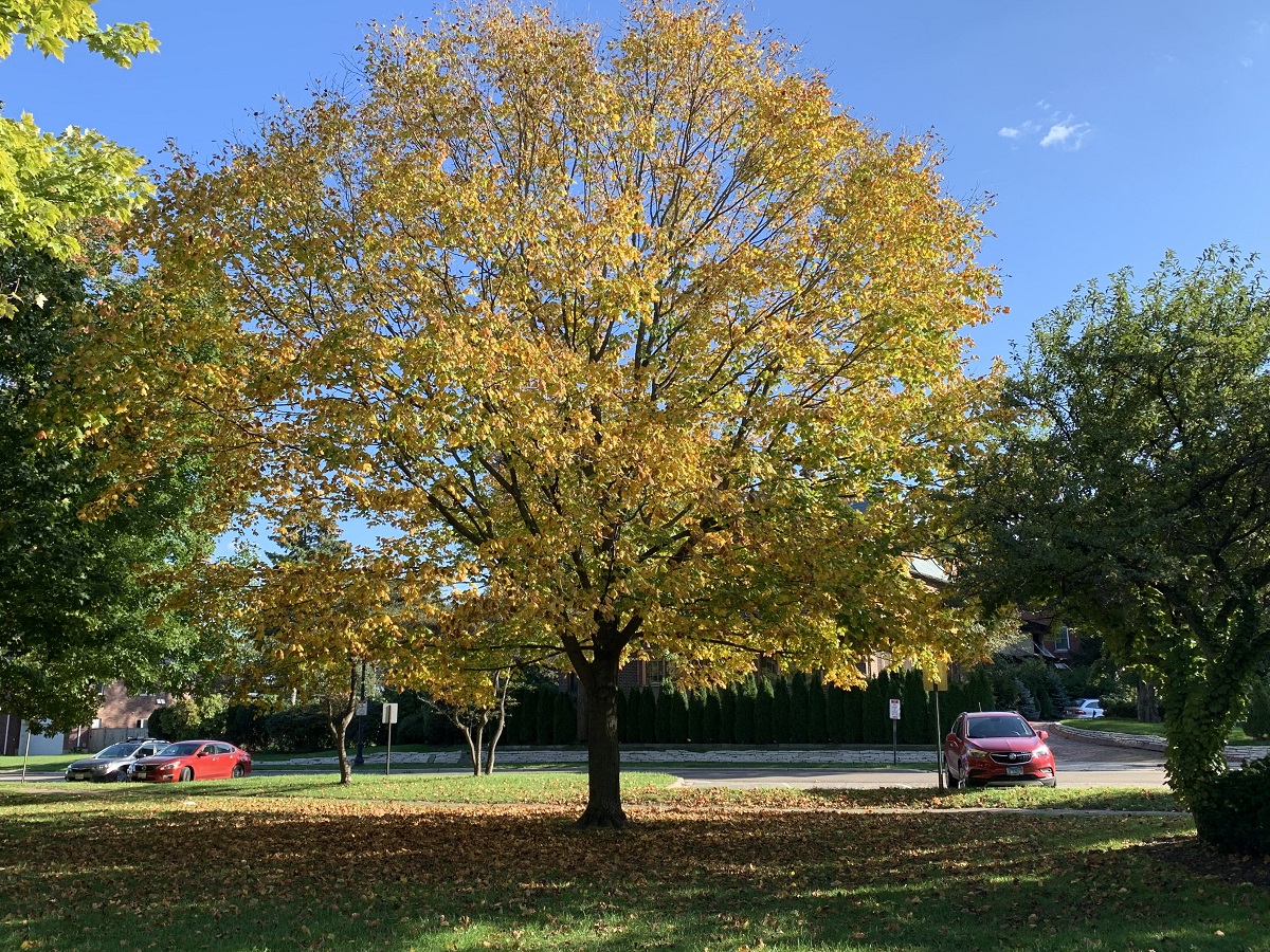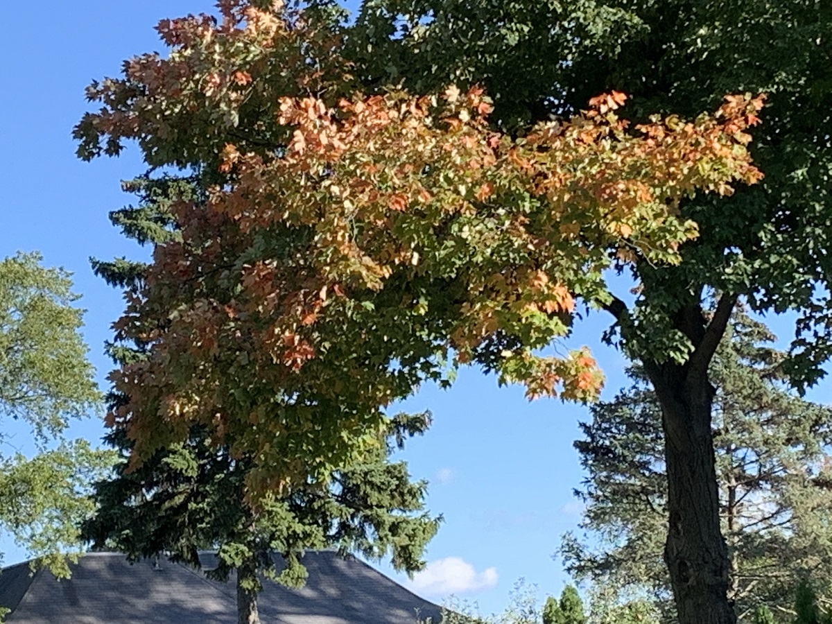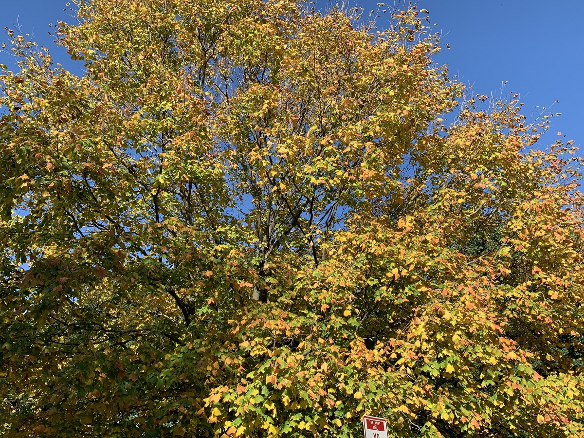 Orange leaves in green maple in Clark Square