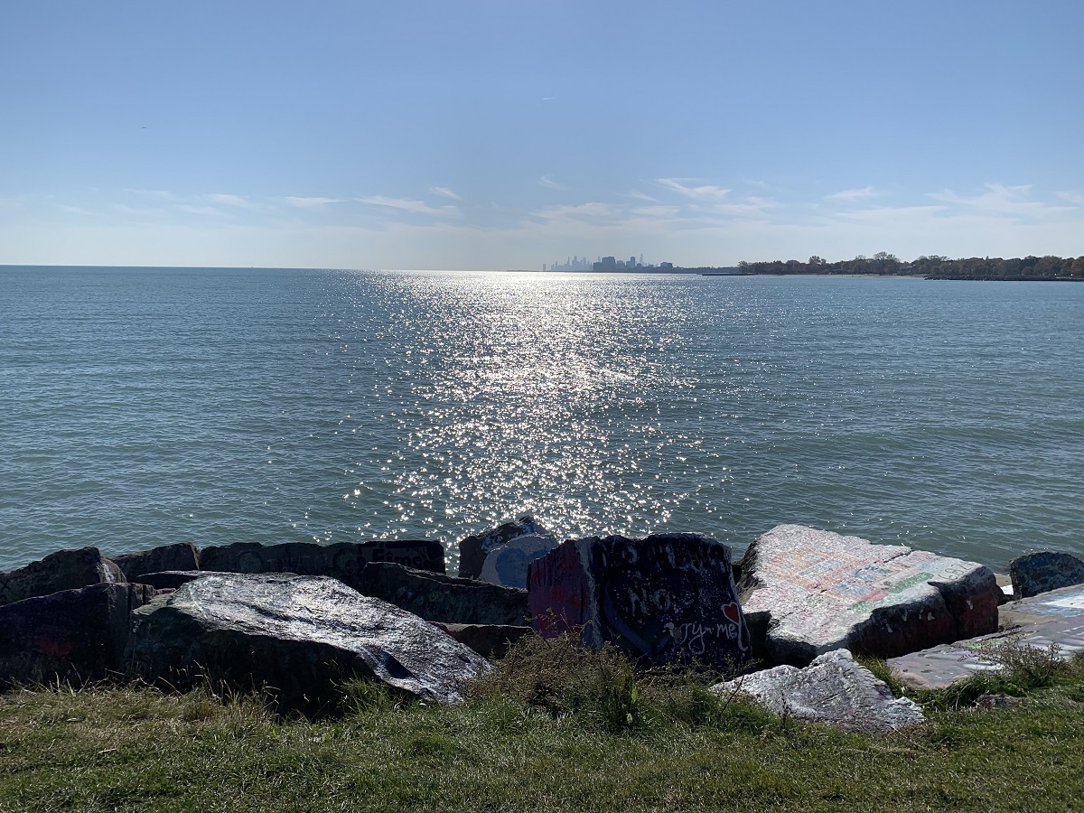 Sun on Lake Michigan from NU landfill, Evanston to Chicago skyline
