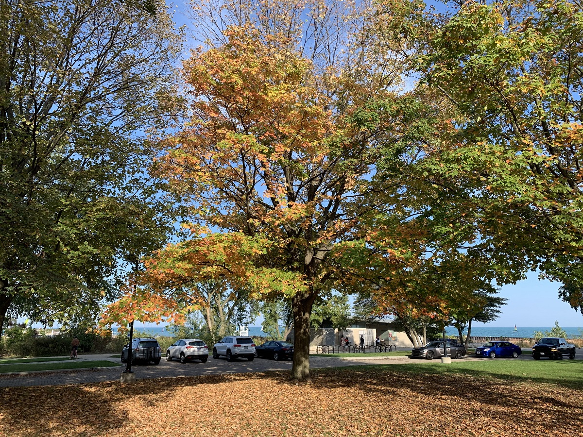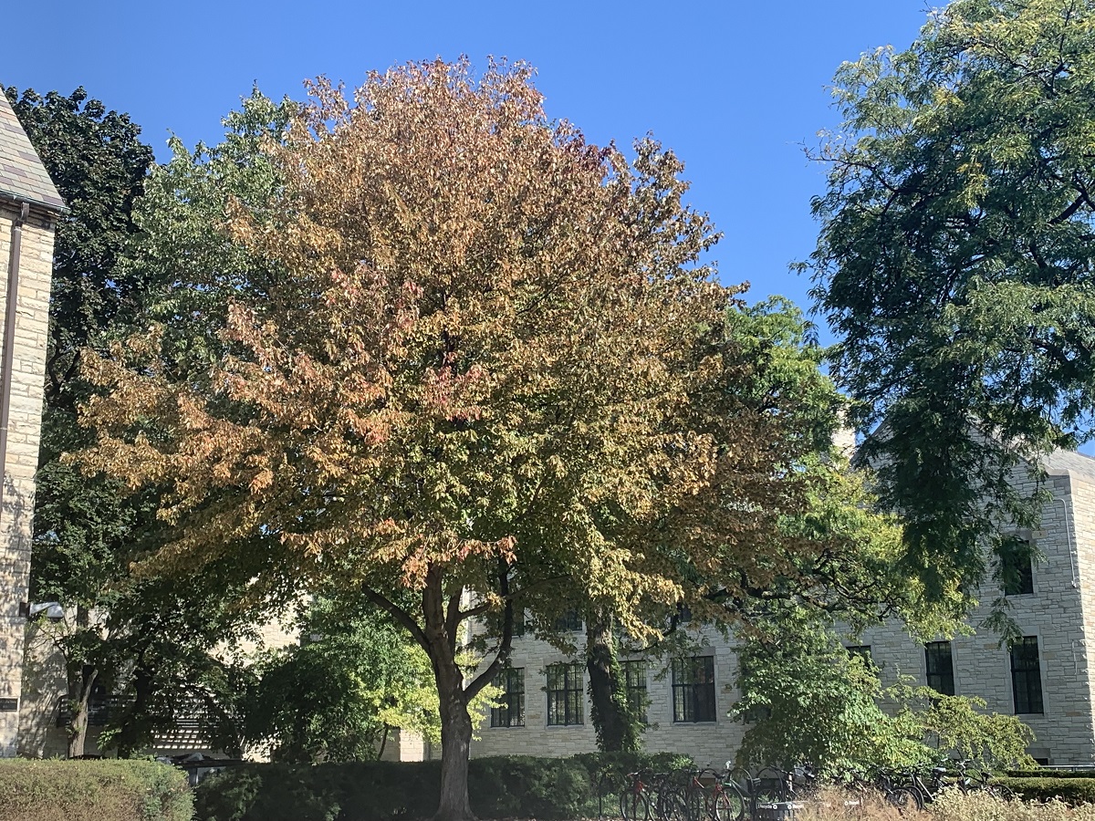 Beautiful bright gold tree on Evanston's lakefront by Clark Street beach house