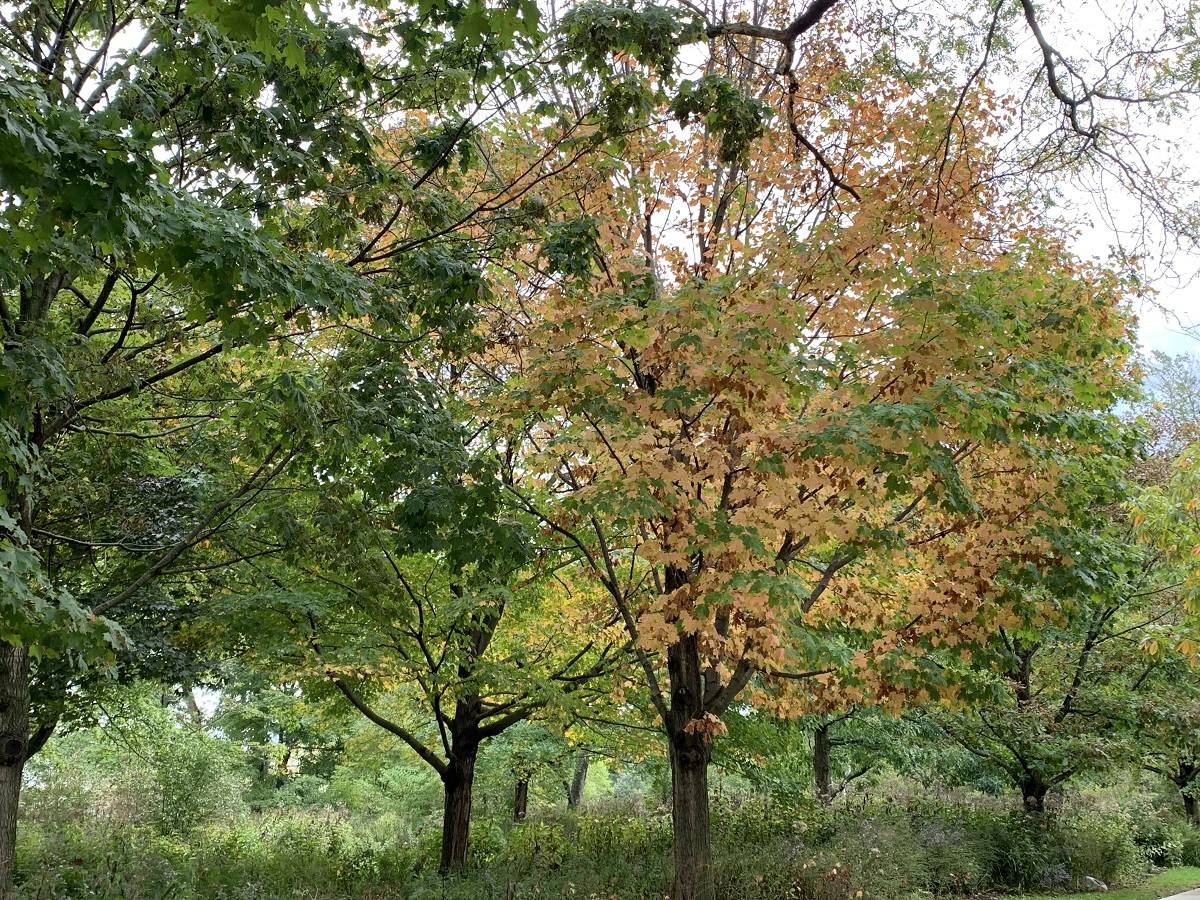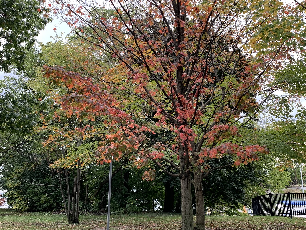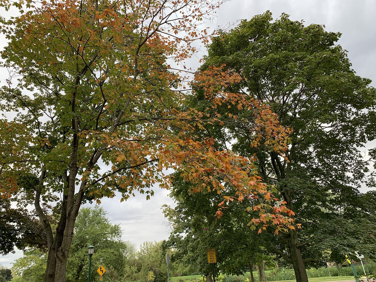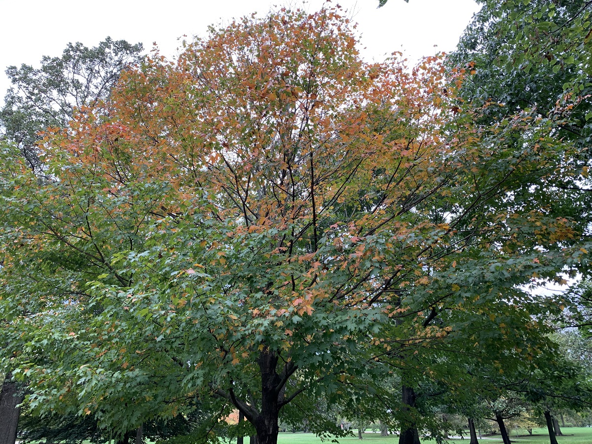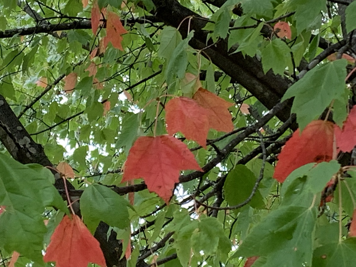 Few bright red leaves on a mostly green maple in Gilson Park