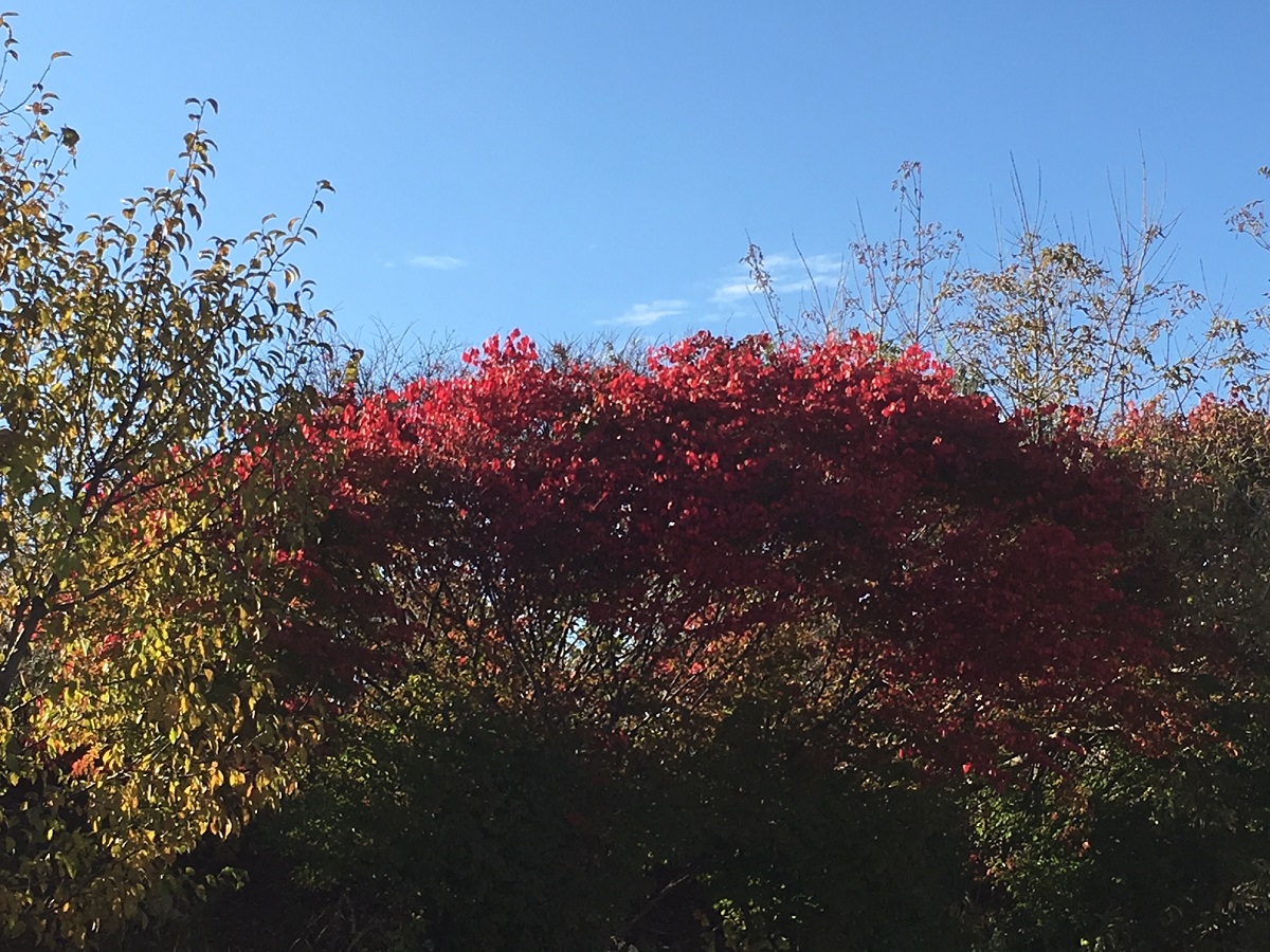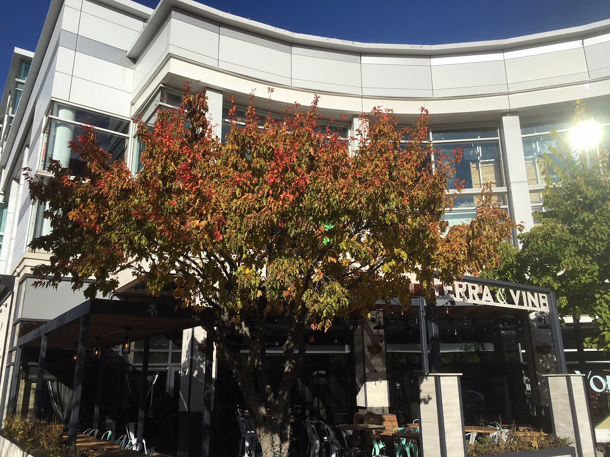 Bright red tree by Metra tracks at University Place