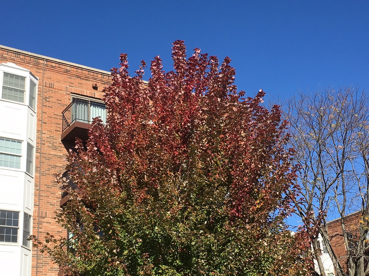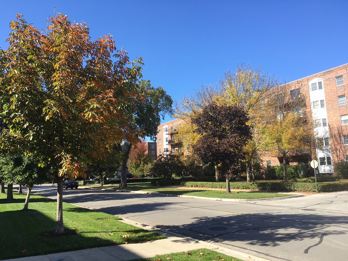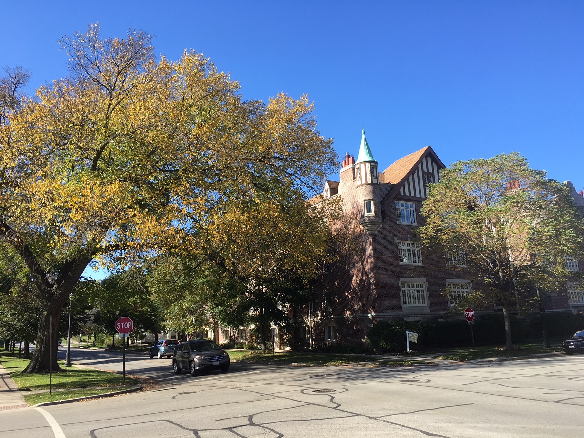 Yellow tree on Lake west of Oak with tower "castle" condo building