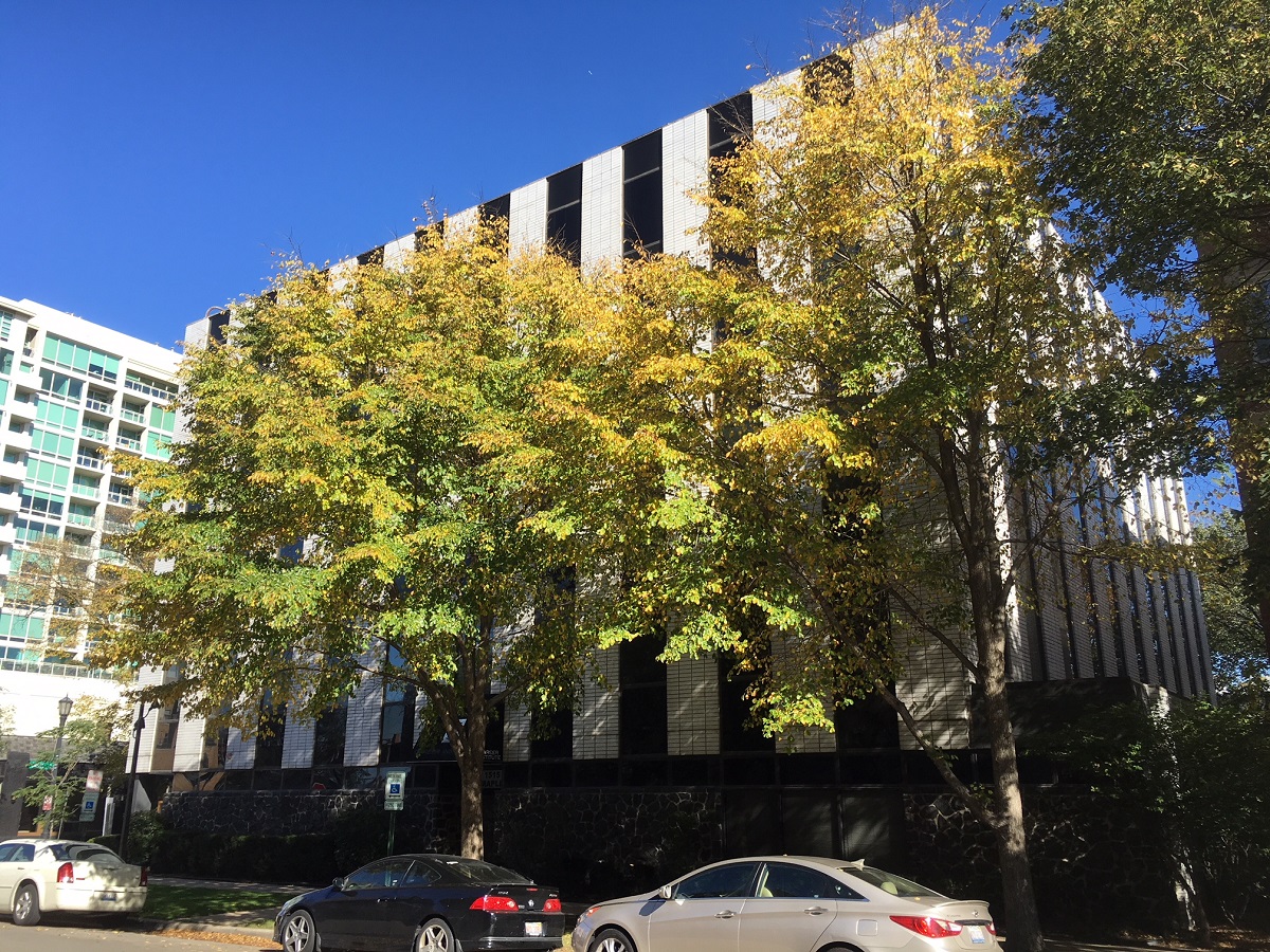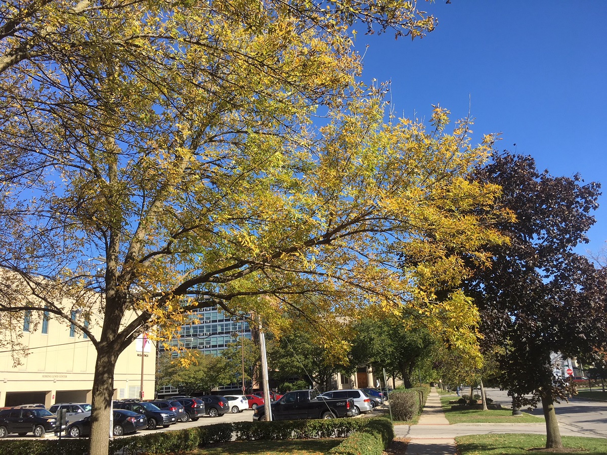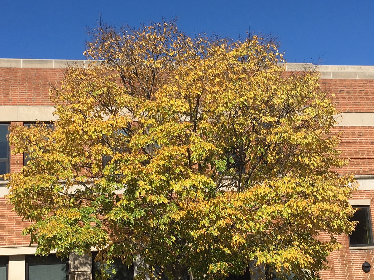 Yellow tree on Lake west of Oak with tower "castle" condo building