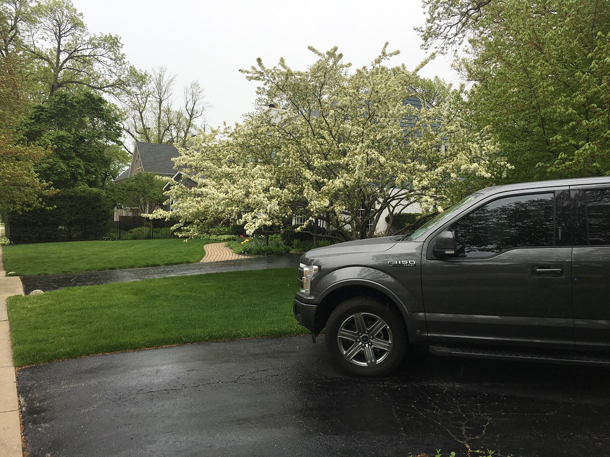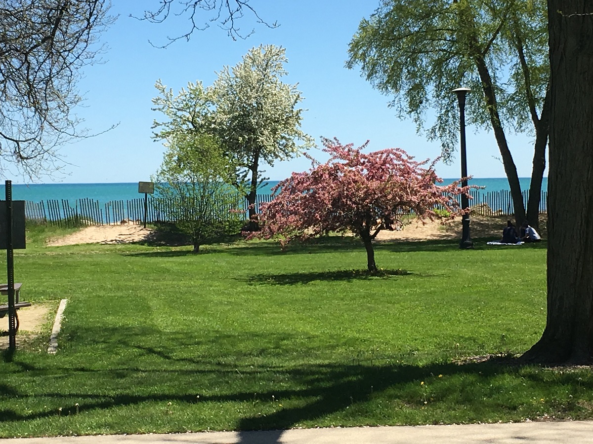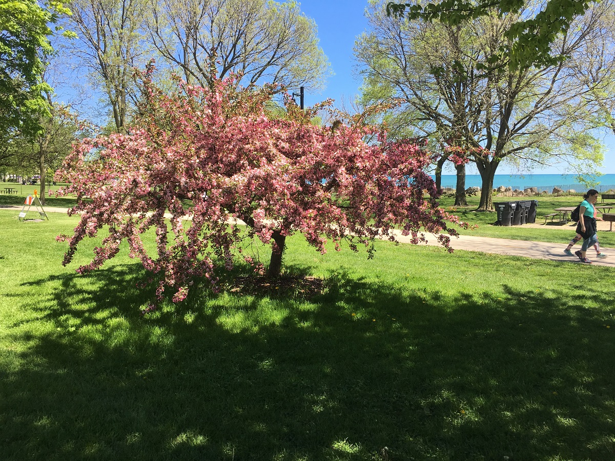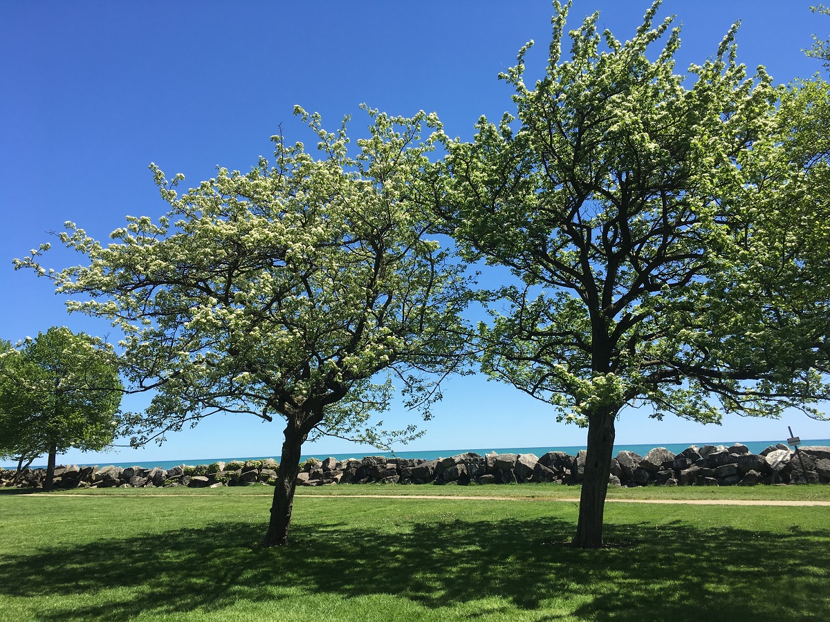 Two white crabapple trees at Evanston lakefront on beautiful warm sunny day -- 5/23/19